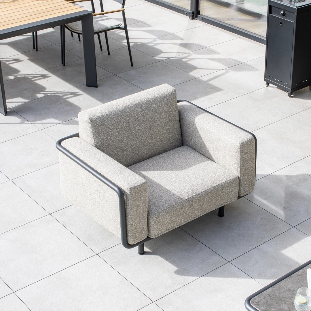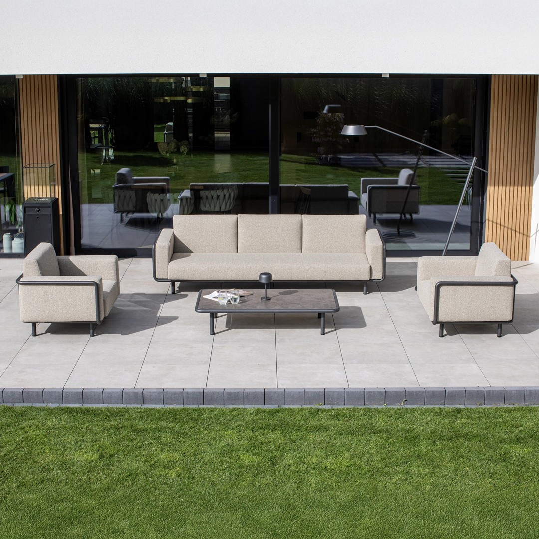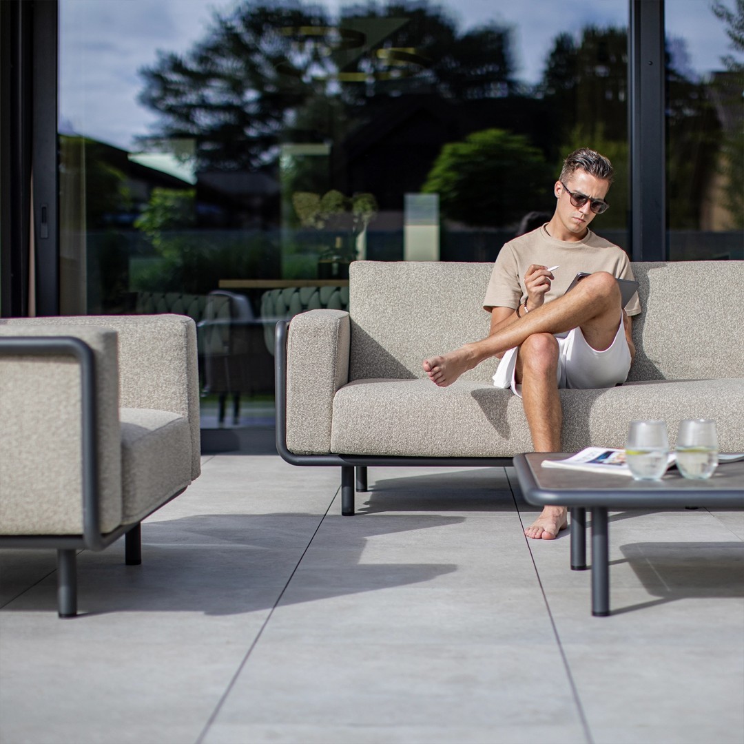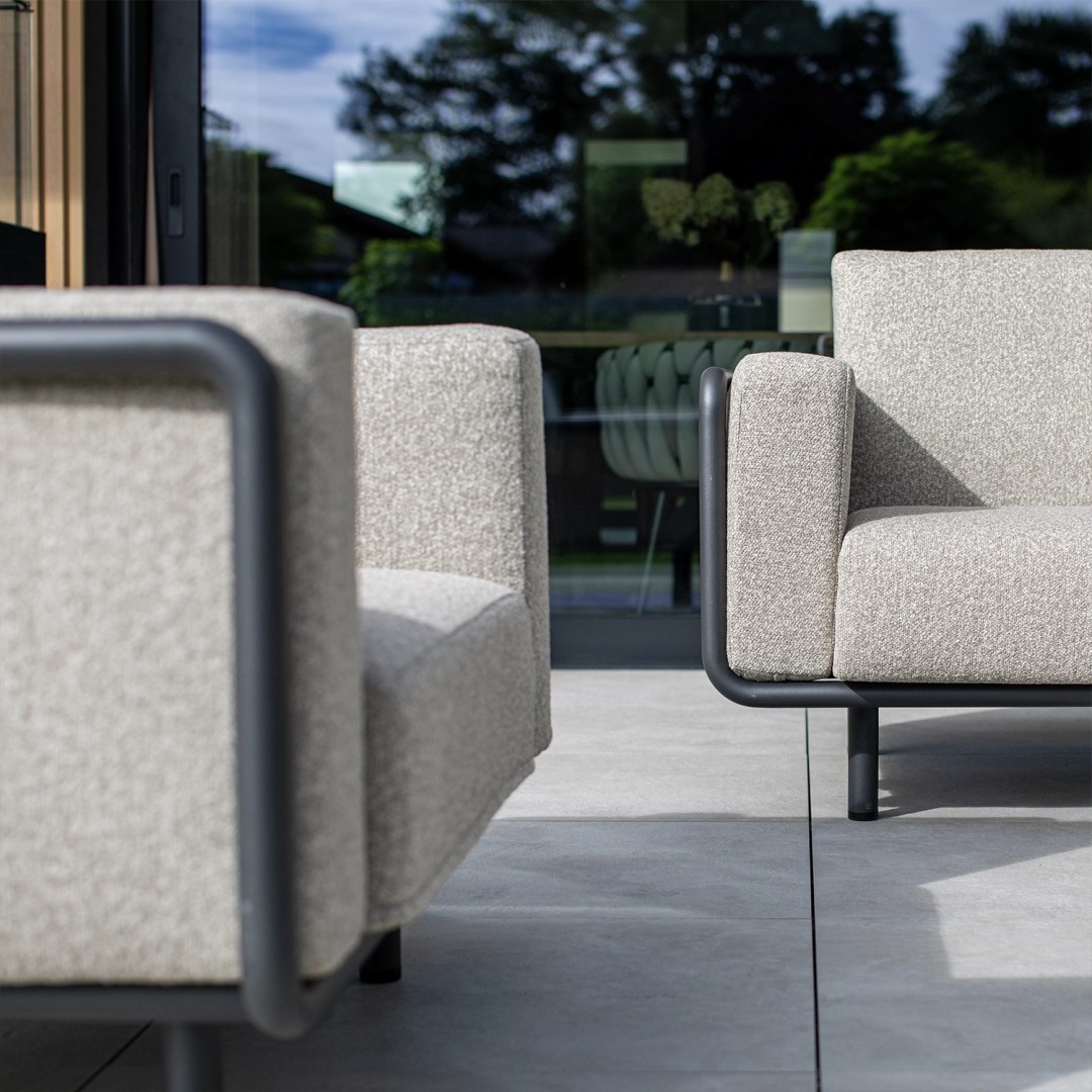 Алюминиевая конструкция с порошковым покрытием обеспечивает стабильность и устойчивость к воздействию внешних условий. Сиденья и спинки, обитые тканью Sunproof, предназначены для использования на открытом воздухе, сохраняя прочность и комфорт материала для повседневного отдыха.