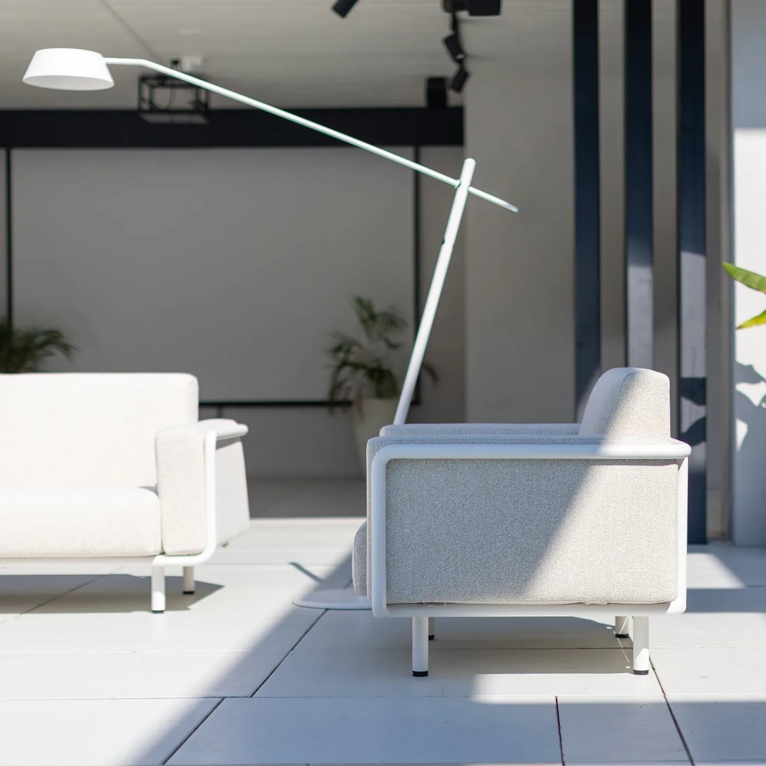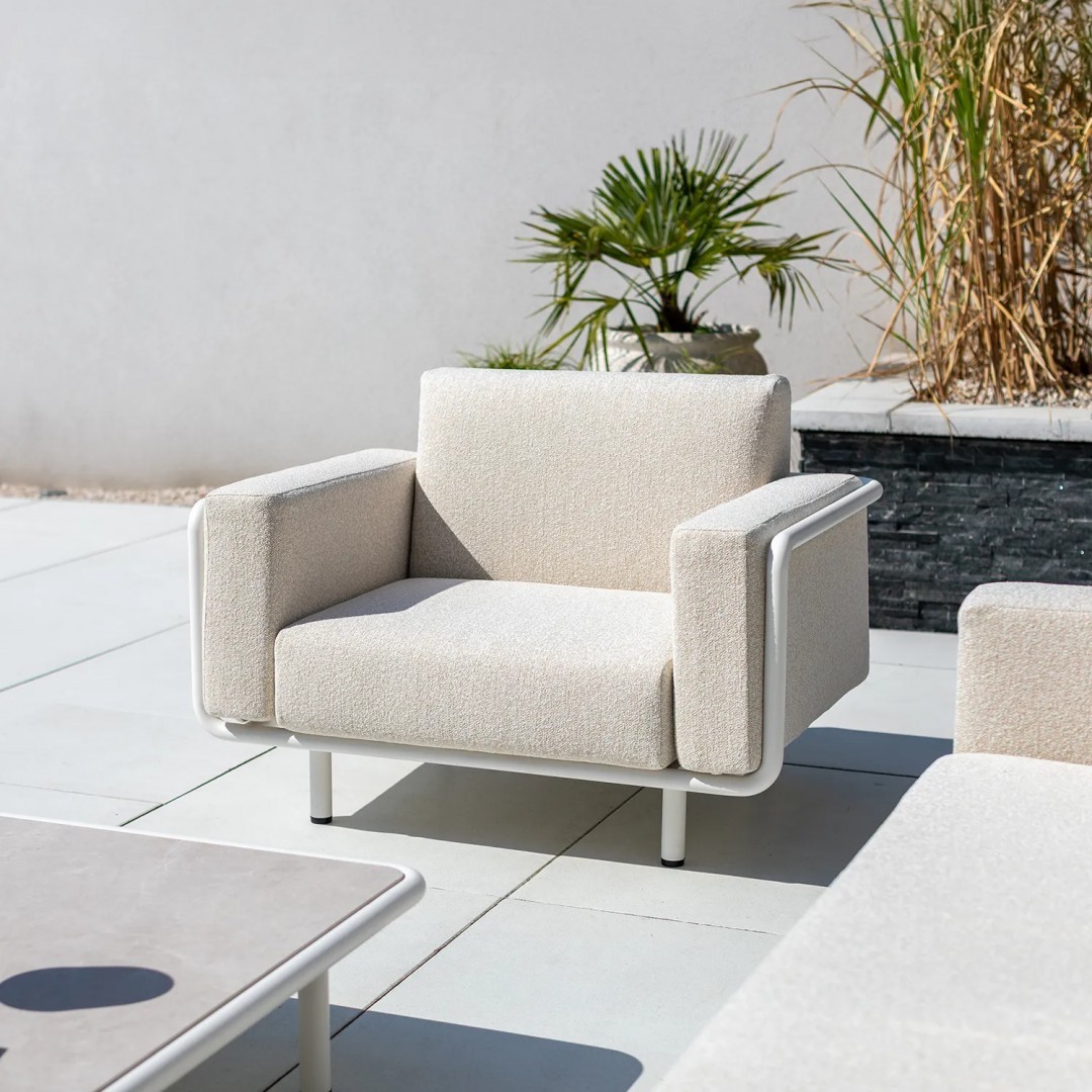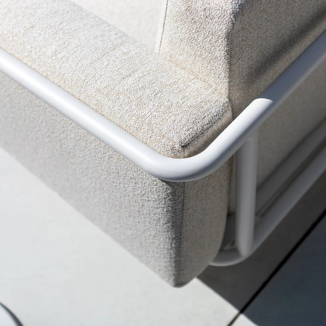 Алюминиевая конструкция с порошковым покрытием обеспечивает стабильность и устойчивость к воздействию внешних условий. Сиденья и спинки, обитые тканью Sunproof, предназначены для использования на открытом воздухе, сохраняя прочность и комфорт материала для повседневного отдыха.