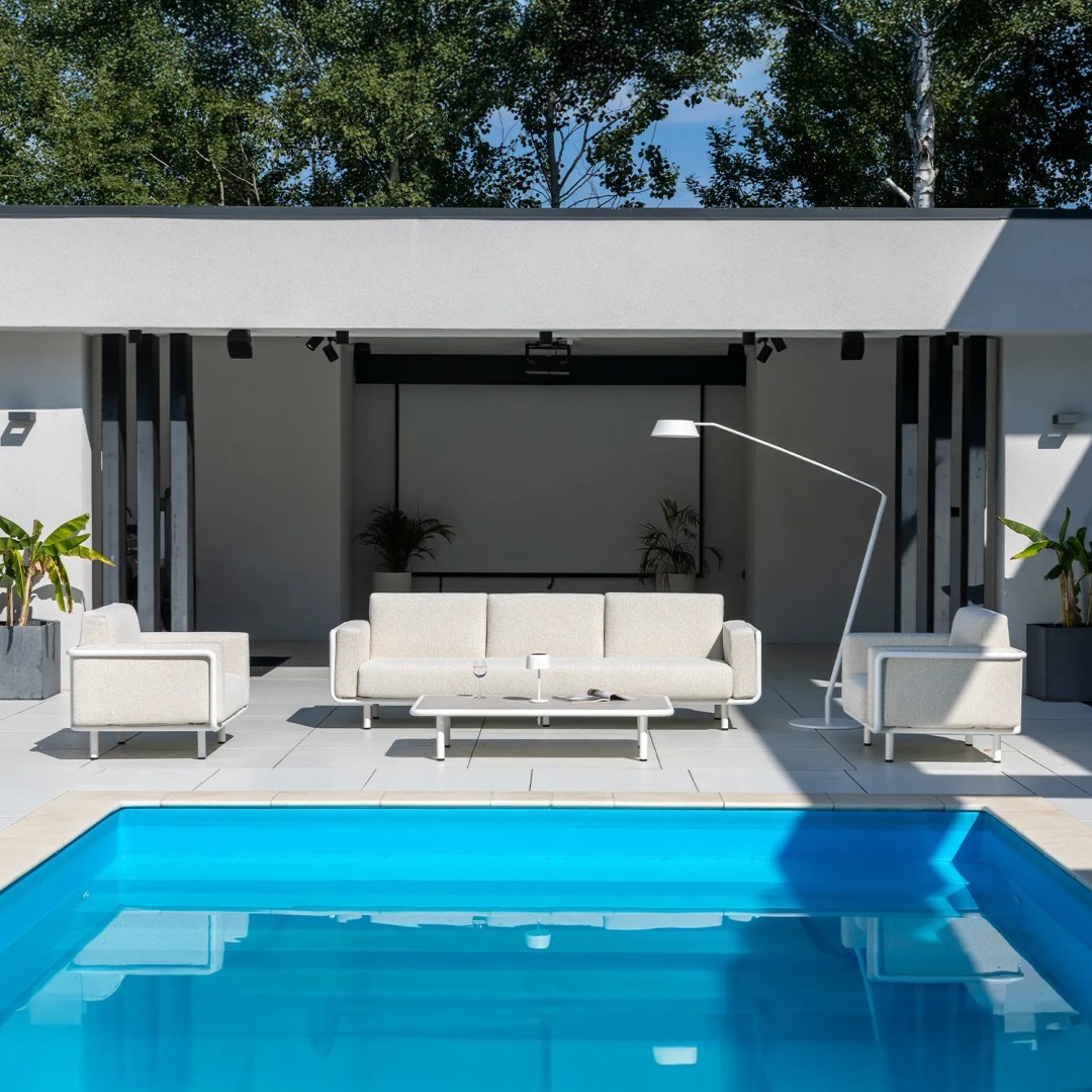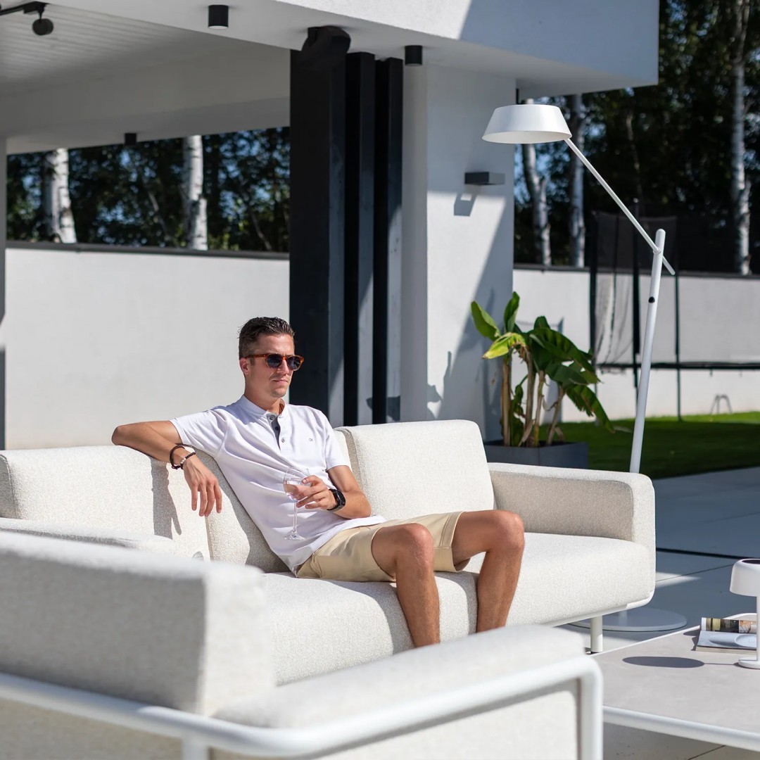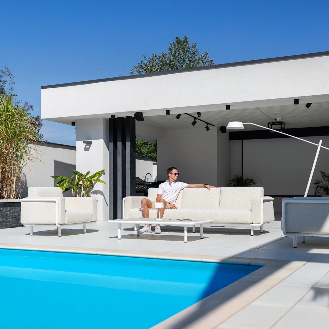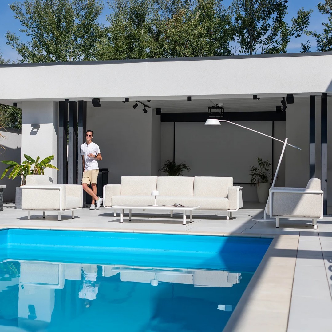 Алюминиевая конструкция с порошковым покрытием обеспечивает стабильность и устойчивость к воздействию внешних условий. Сиденья и спинки, обитые тканью Sunproof, предназначены для использования на открытом воздухе, сохраняя прочность и комфорт материала для повседневного отдыха.