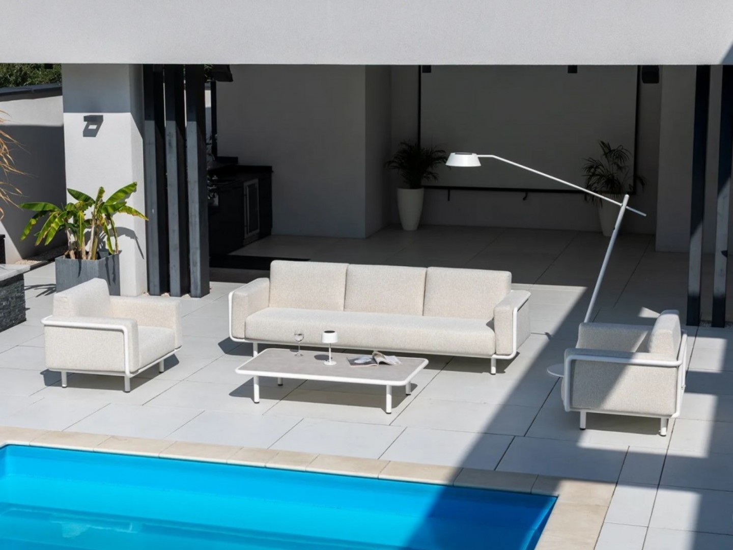 Дизайн комплекта основан на простых геометрических формах и четких пропорциях. Низкие линии сидений и четко очерченный каркас придают всему изделию современный, лаконичный характер, который хорошо сочетается с современной архитектурой и минималистичными открытыми пространствами.