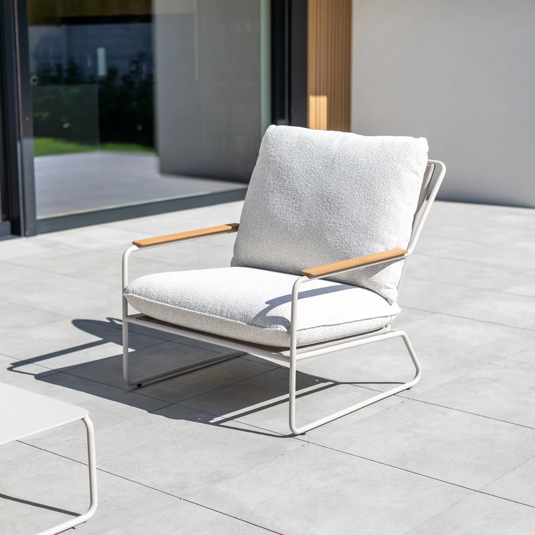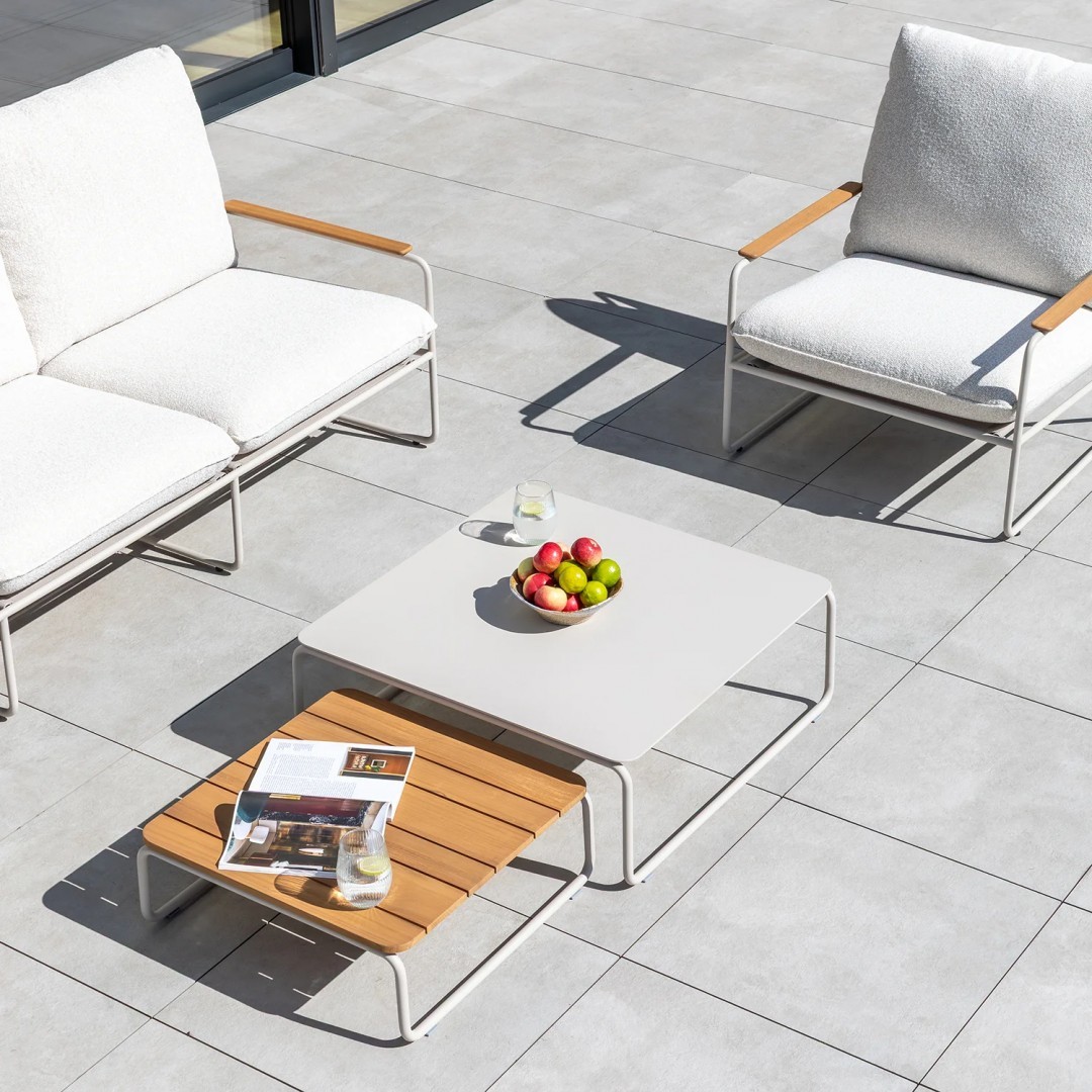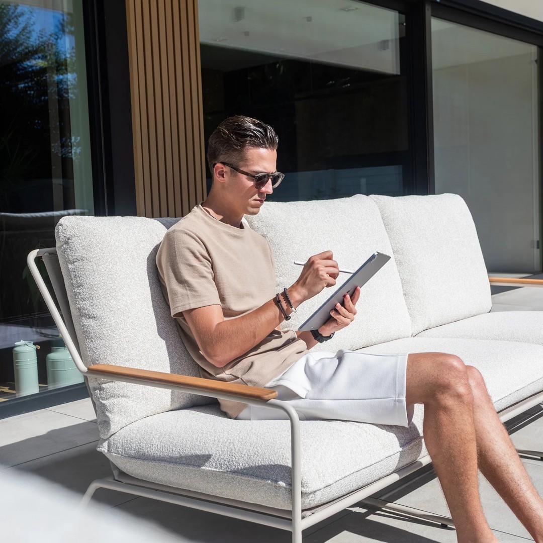 Форма мебели основана на плавных линиях сидений, установленных на характерном алюминиевом каркасе. Пропорции отдельных элементов обеспечивают комфортное использование как в компании, так и индивидуально. Комплект хорошо сочетается с современной архитектурой и зеленью сада или патио.