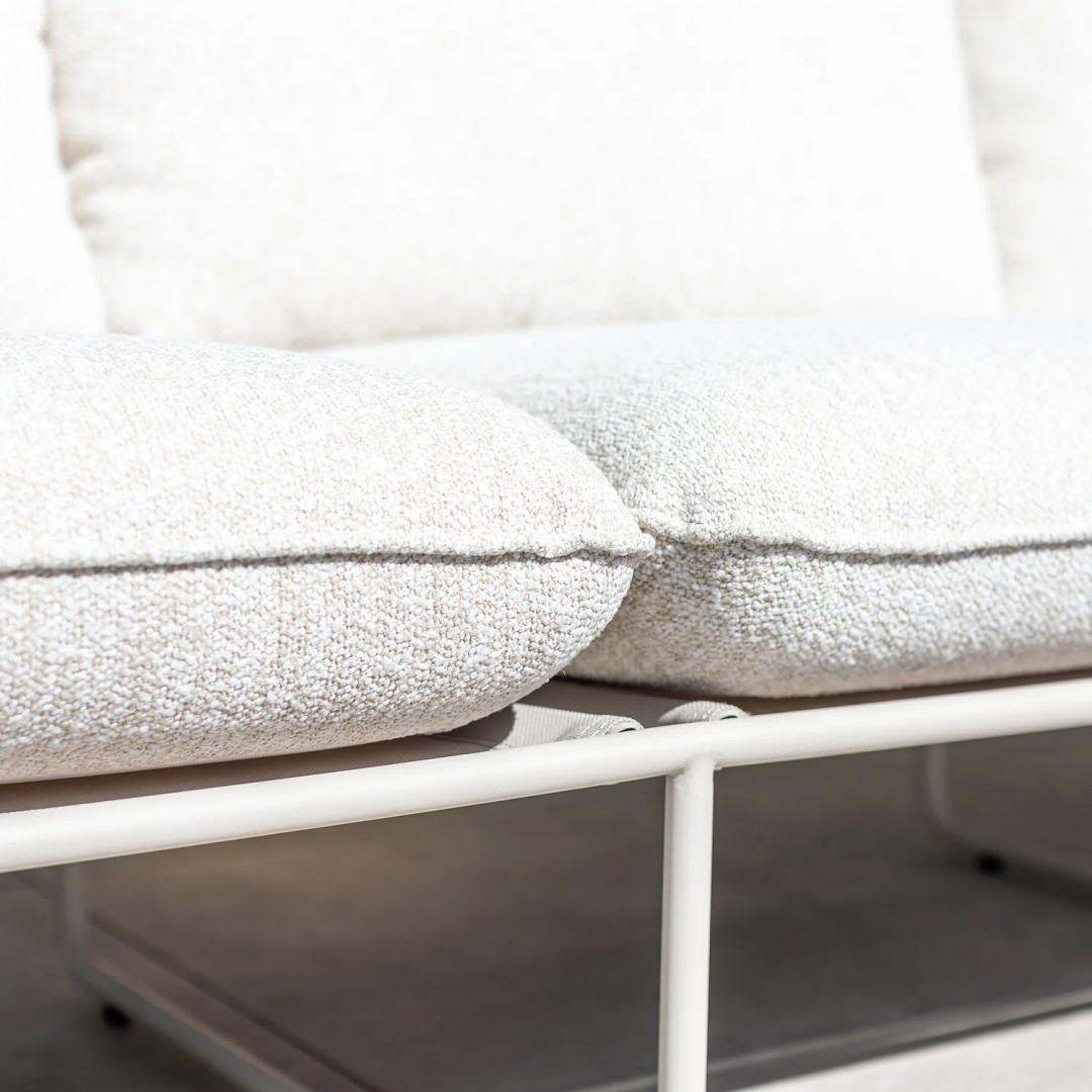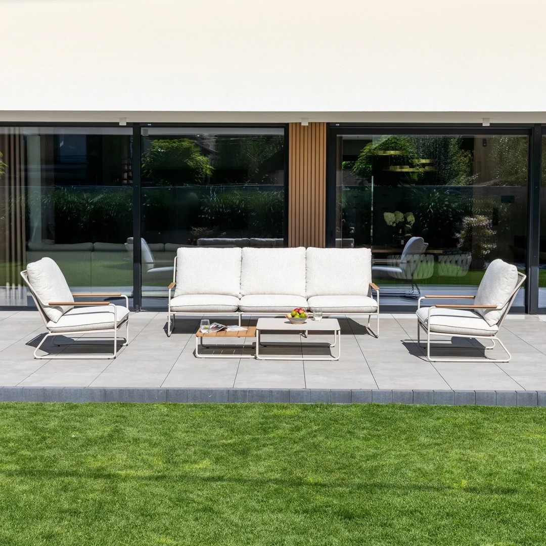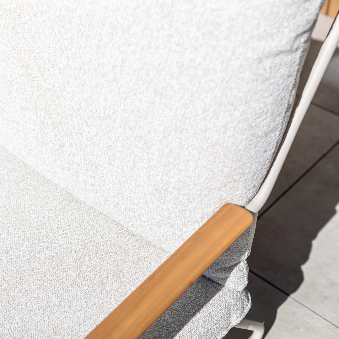 Алюминиевая конструкция с порошковым покрытием обеспечивает стабильность и устойчивость к воздействию внешних условий. Сиденья и спинки обиты тканью Sunproof и наполнены стандартным пенополиуретаном, сохраняющим свою форму при регулярном использовании. В комплект входят защитные чехлы для удобного хранения.