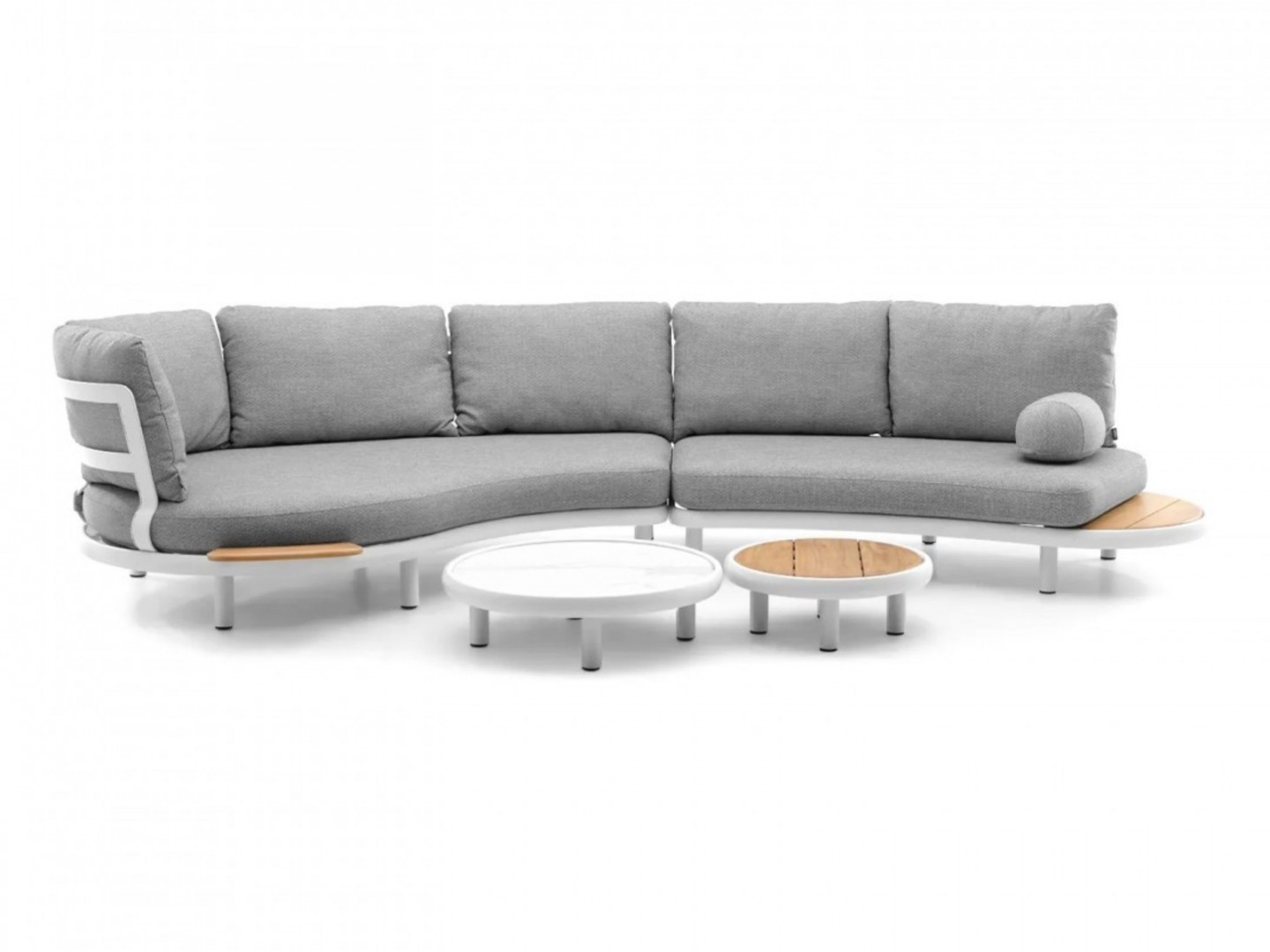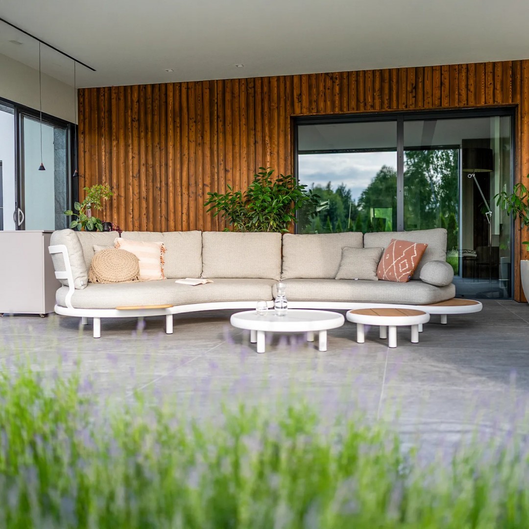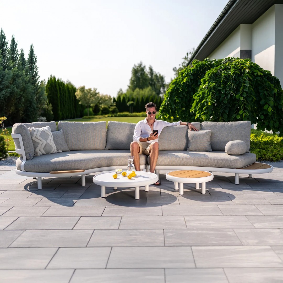 Откройте для себя уникальный комплект садовой мебели CLOUD, созданный с заботой о комфорте и элегантности. Комплект CLOUD можно установить как слева, так и справа, перевернув каркас и вращая ножки. Комплект состоит из шезлонга каплевидной формы, слегка закругленного двухместного дивана с приставным столиком из тика, двух журнальных столиков, дополнительного приставного столика и подлокотника.