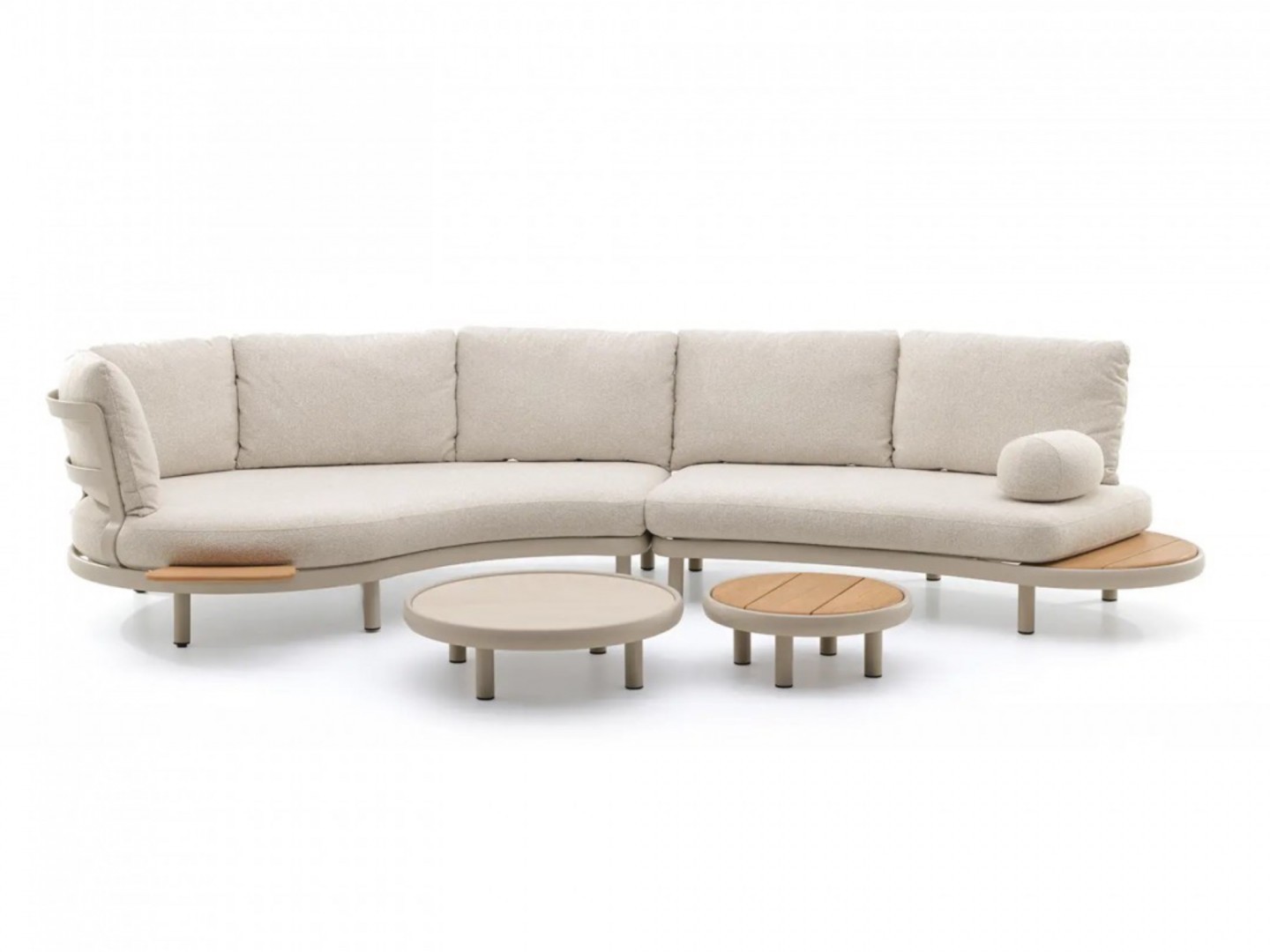 Откройте для себя уникальный комплект садовой мебели CLOUD, созданный с заботой о комфорте и элегантности. Комплект CLOUD можно установить как слева, так и справа, перевернув каркас и вращая ножки. Комплект состоит из шезлонга каплевидной формы, слегка закругленного двухместного дивана с приставным столиком из тика, двух журнальных столиков, дополнительного приставного столика и подлокотника.