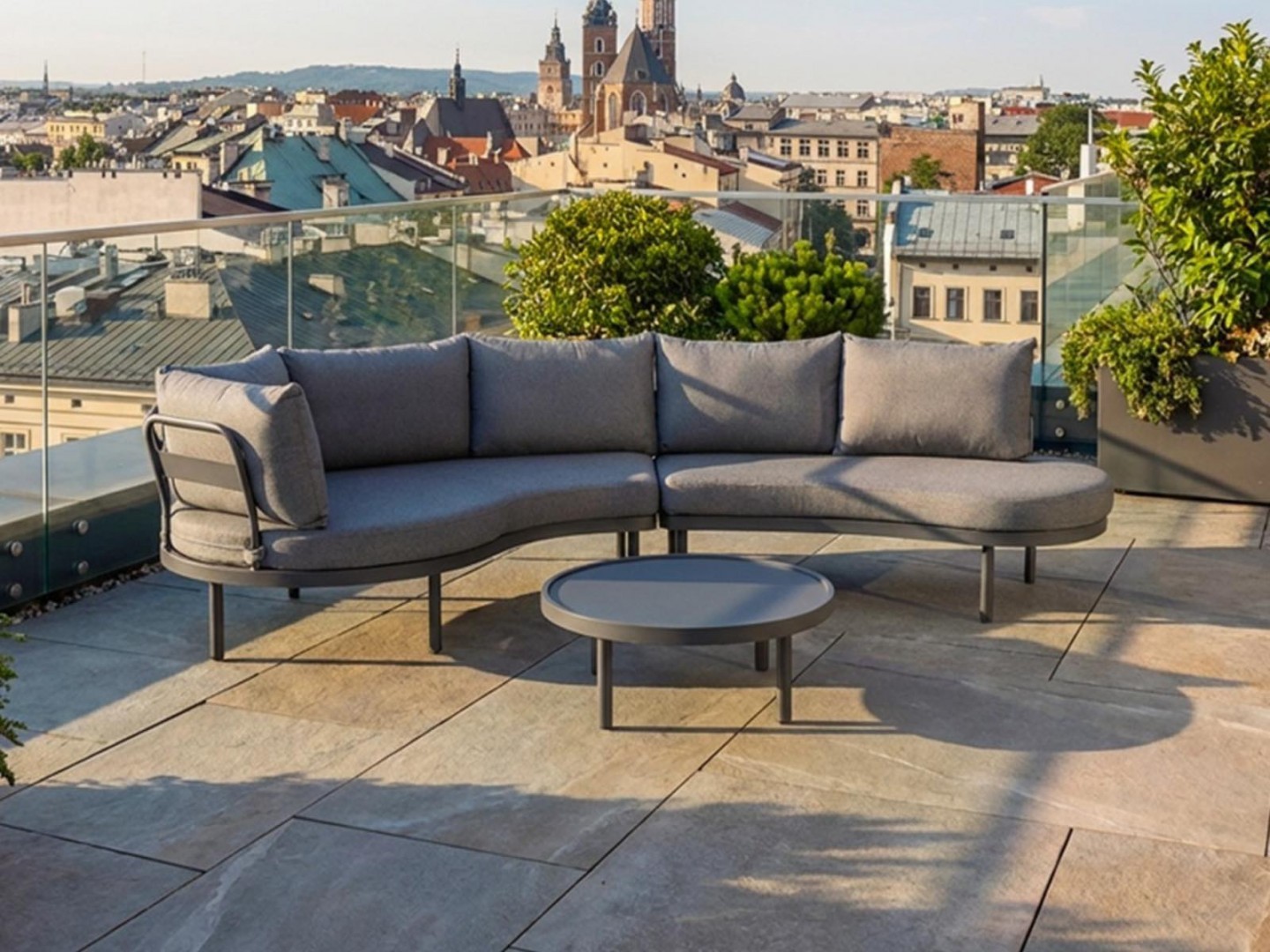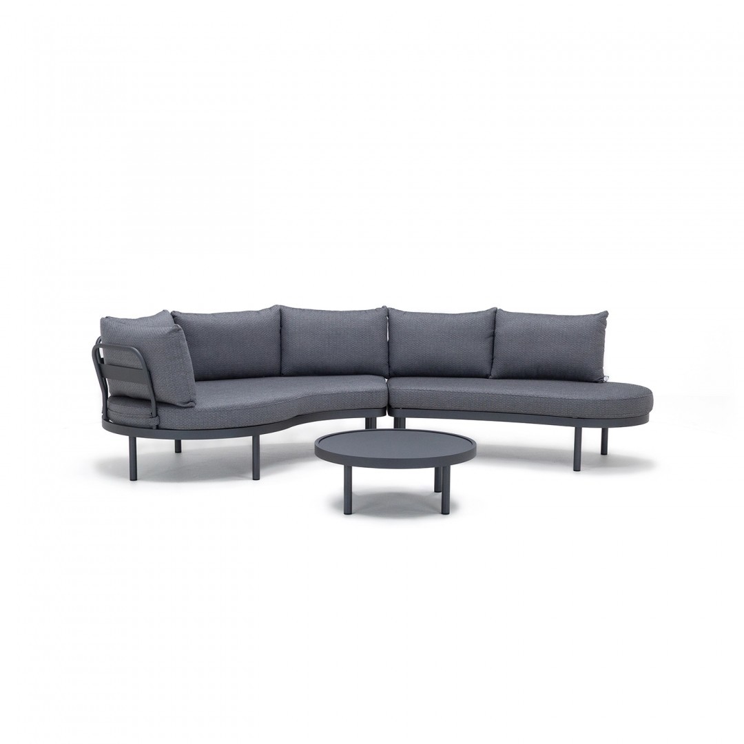 Форма комплекта основана на мягких линиях и низкой, устойчивой форме. Пропорции отдельных элементов позволяют гибко размещать его как в больших, так и в небольших открытых пространствах. Нейтральная цветовая гамма хорошо сочетается с современной архитектурой и природным окружением.