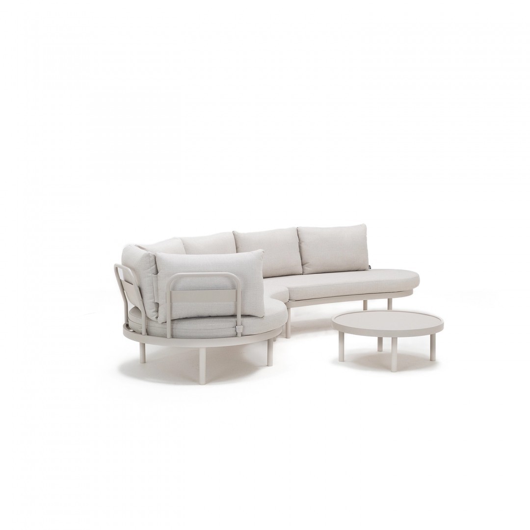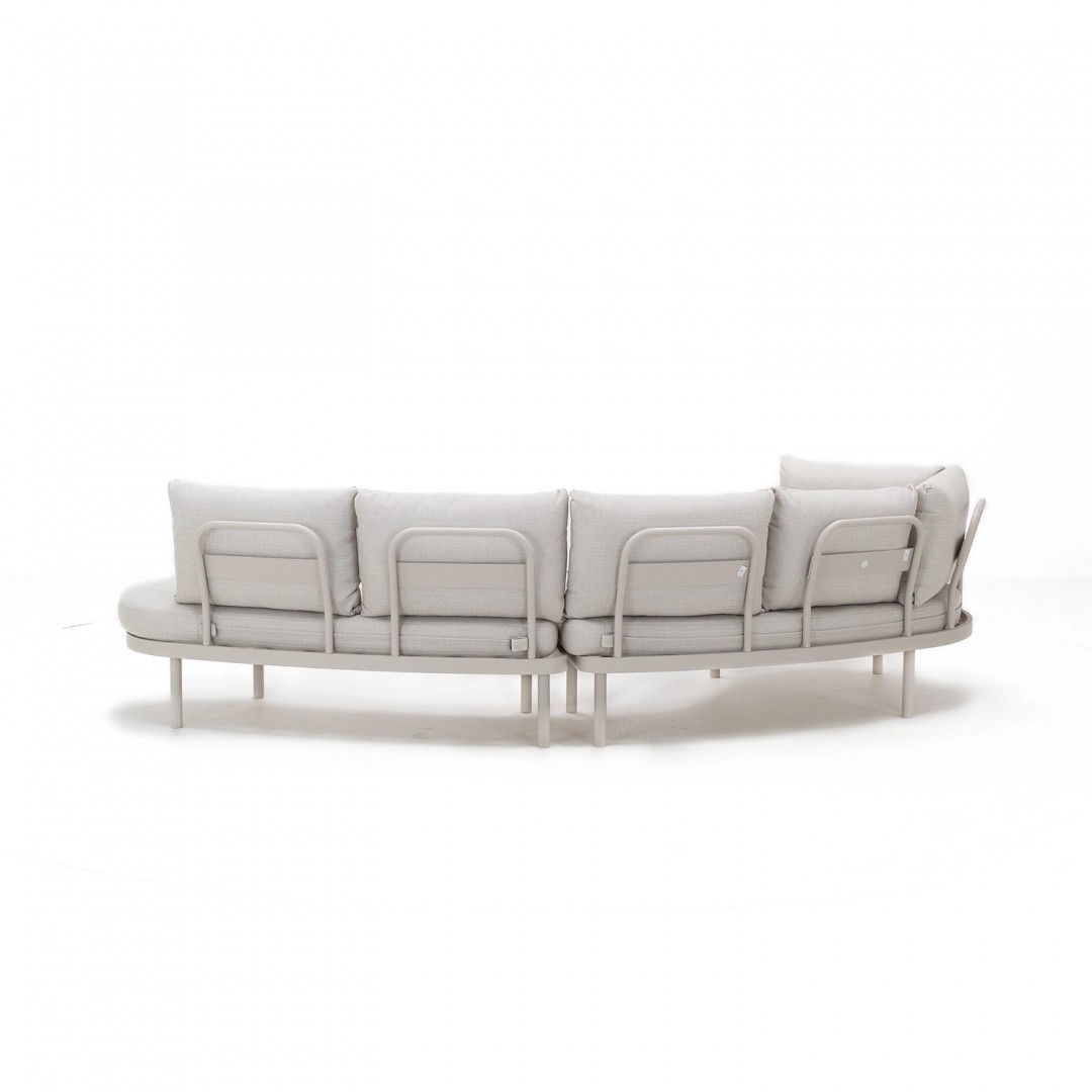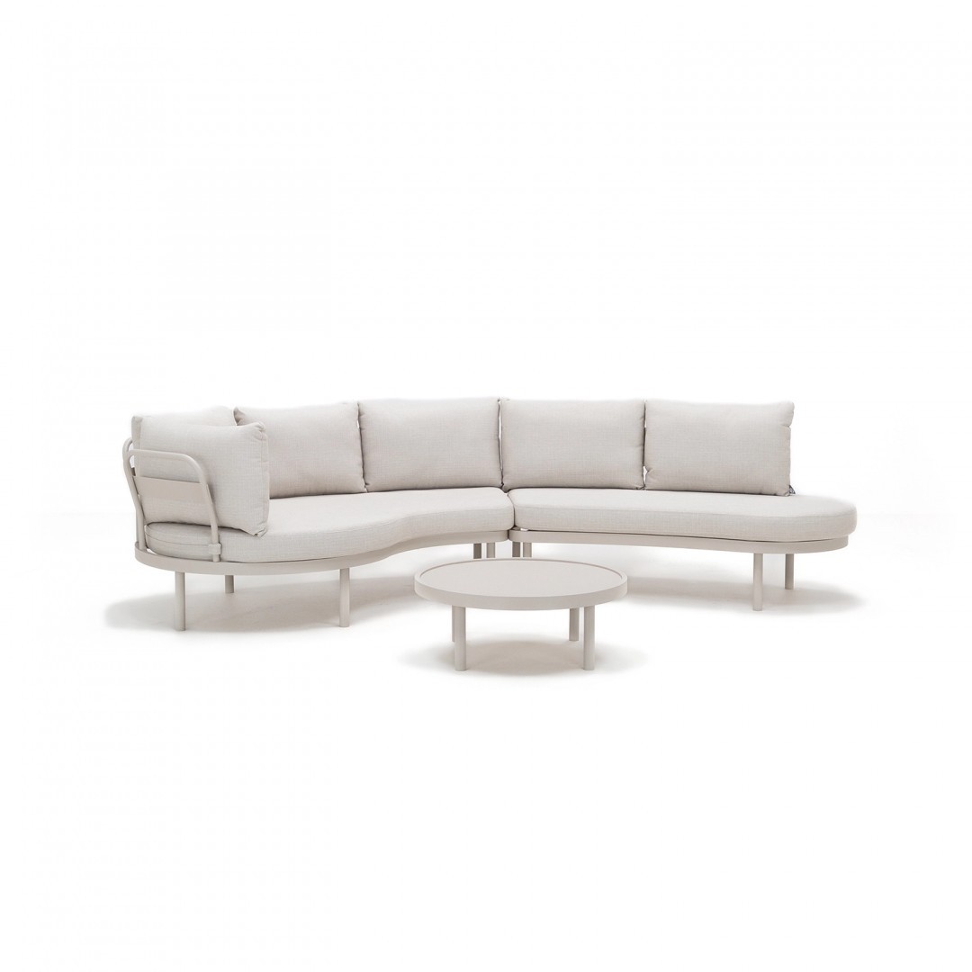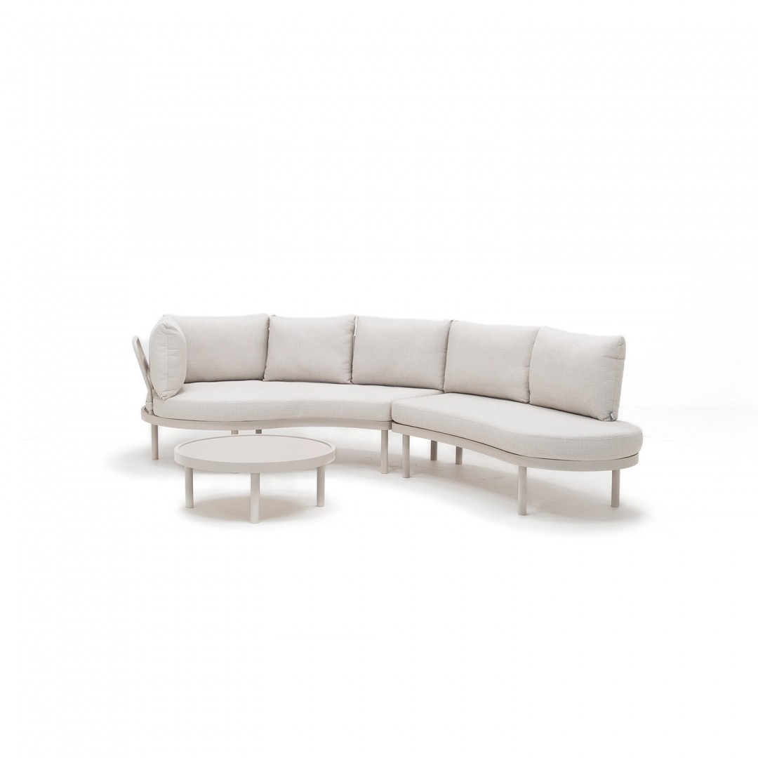 Форма комплекта основана на мягких линиях и низкой, устойчивой форме. Пропорции отдельных элементов позволяют гибко размещать его как в больших, так и в небольших открытых пространствах. Нейтральная цветовая гамма хорошо сочетается с современной архитектурой и природным окружением.
