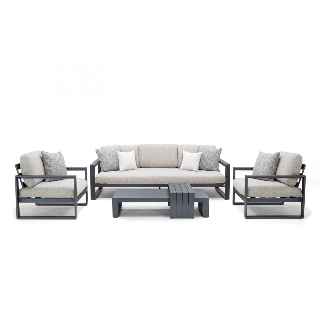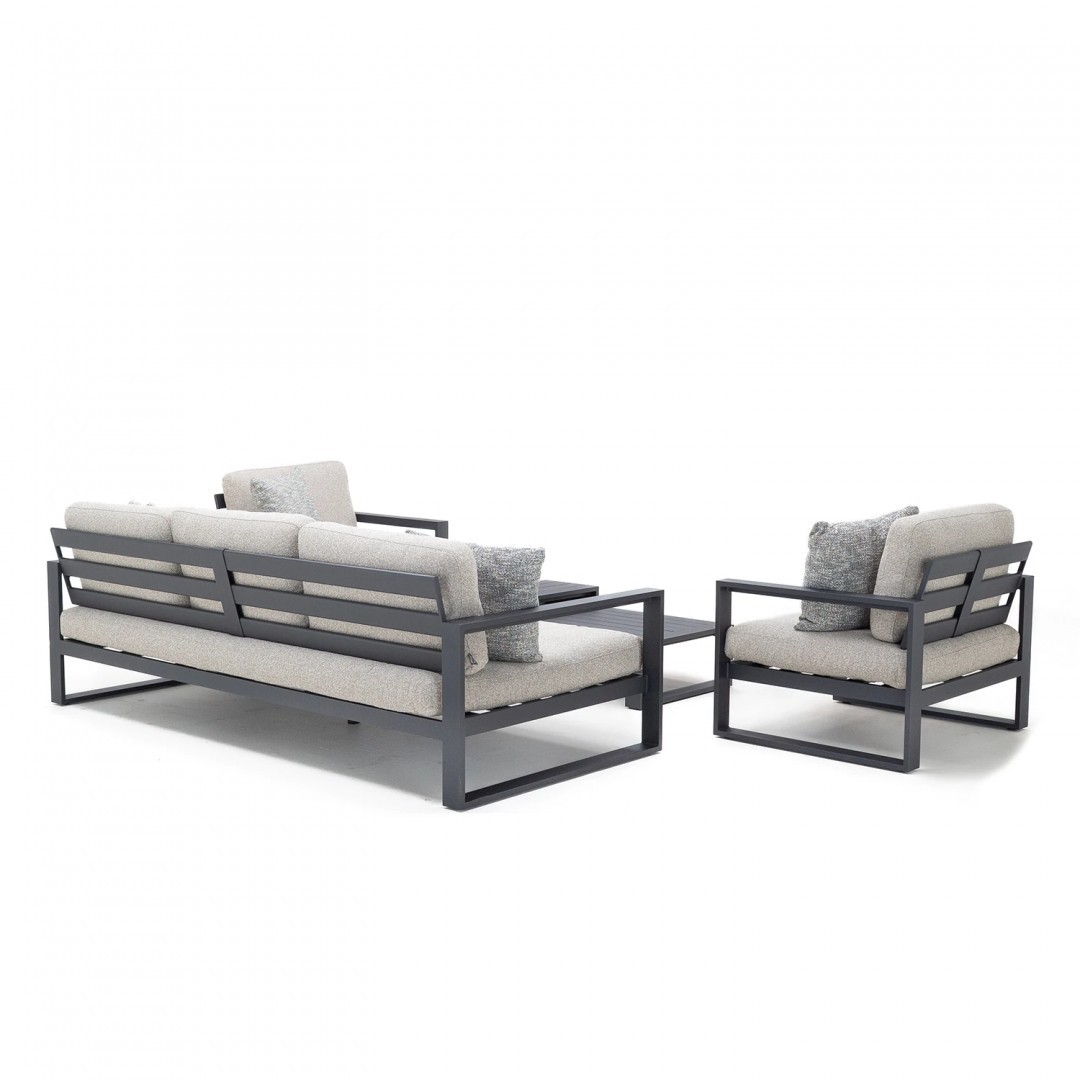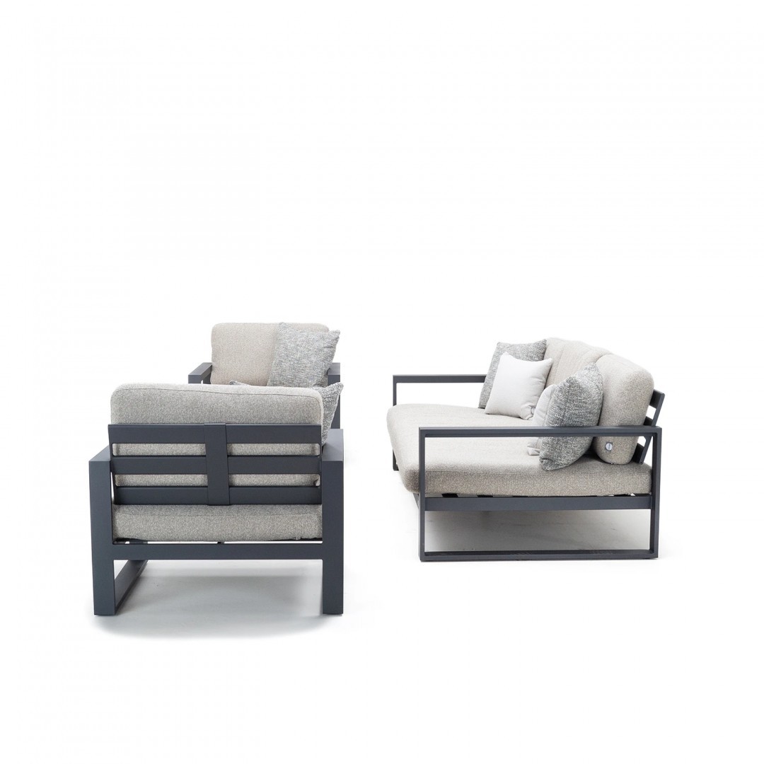 Алюминиевая конструкция с порошковым покрытием обеспечивает стабильность, долговечность и устойчивость к погодным условиям. Сиденья и спинки, обитые тканью Sunproof Jalousie 160 и наполненные стандартным пенополиуретаном, сохраняют свою форму и комфорт даже при интенсивном использовании. Дополнительные съемные подушки повышают комфорт и позволяют настроить комплект в соответствии с вашими индивидуальными предпочтениями.