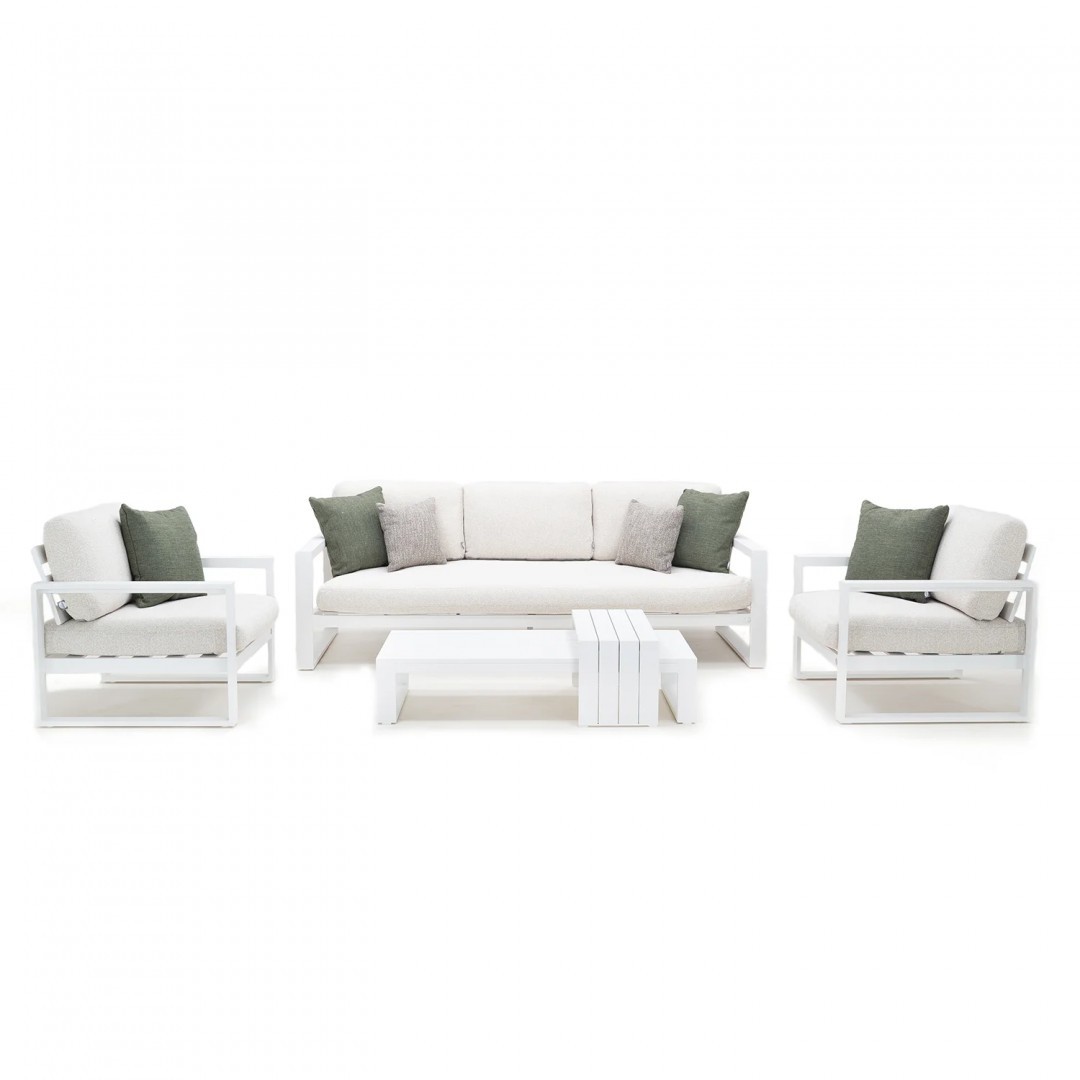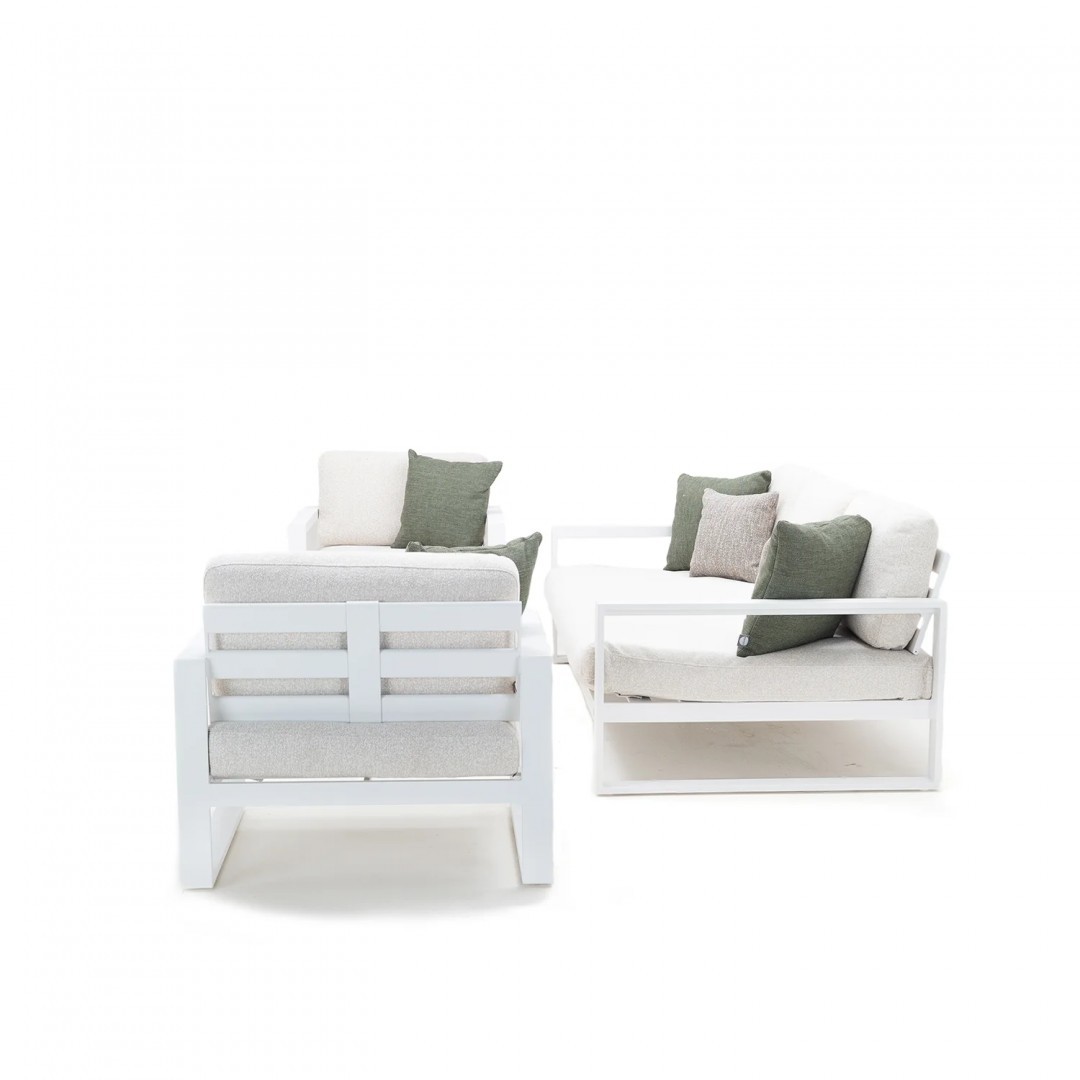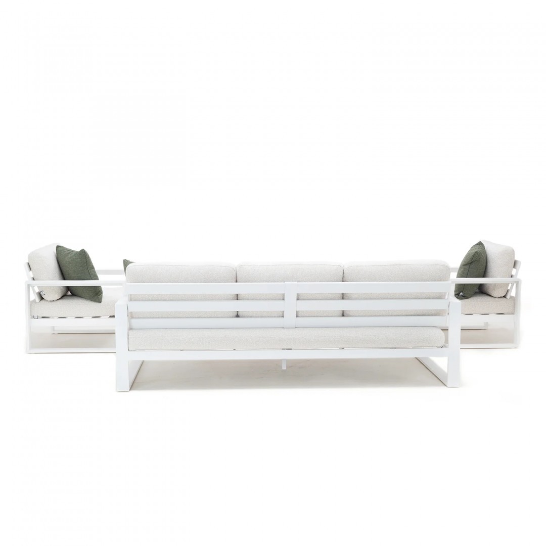 Алюминиевая конструкция с порошковым покрытием обеспечивает стабильность, долговечность и устойчивость к погодным условиям. Сиденья и спинки, обитые тканью Sunproof Jalousie 160 и наполненные стандартным пенополиуретаном, сохраняют свою форму и комфорт даже при интенсивном использовании. Дополнительные съемные подушки повышают комфорт и позволяют настроить комплект в соответствии с вашими индивидуальными предпочтениями.