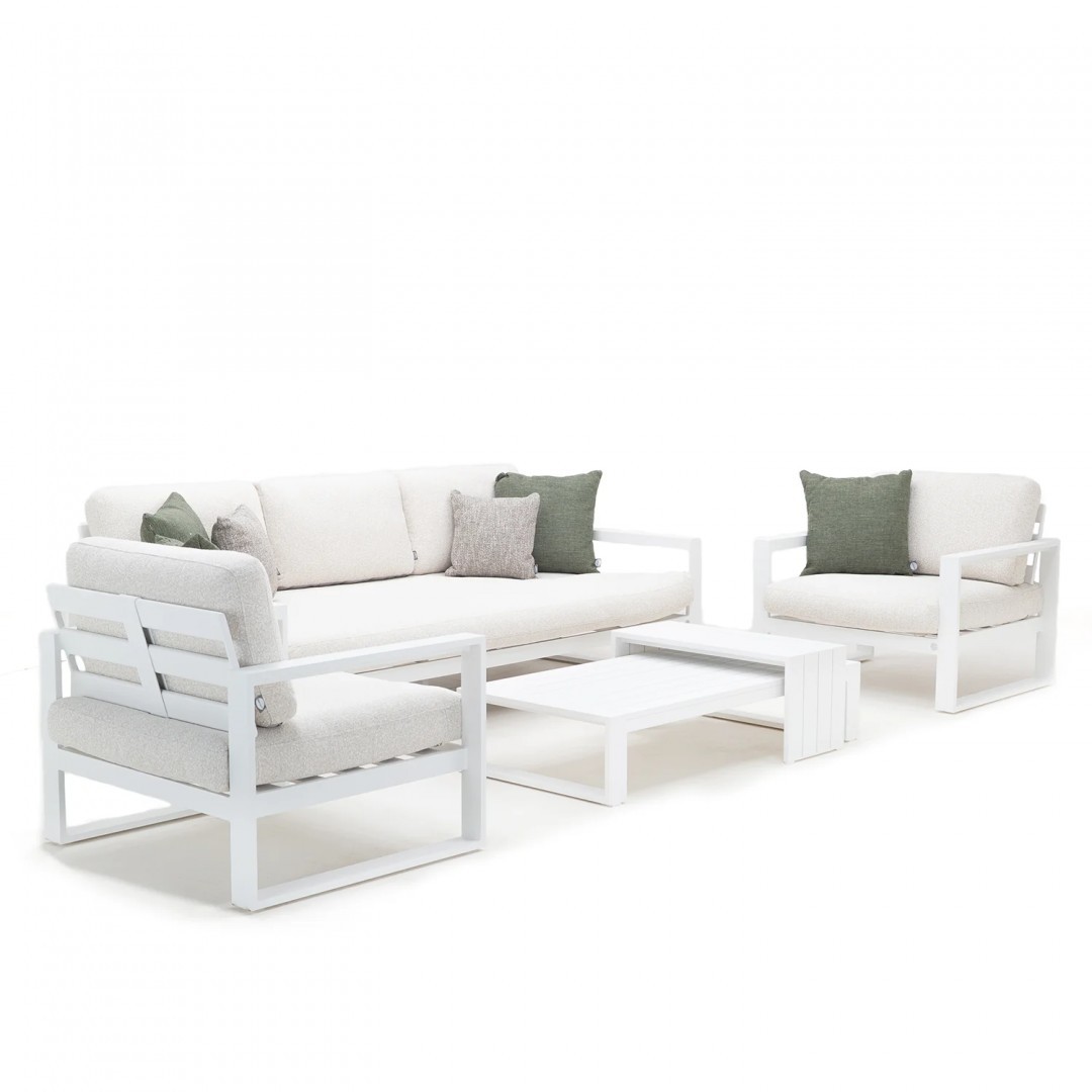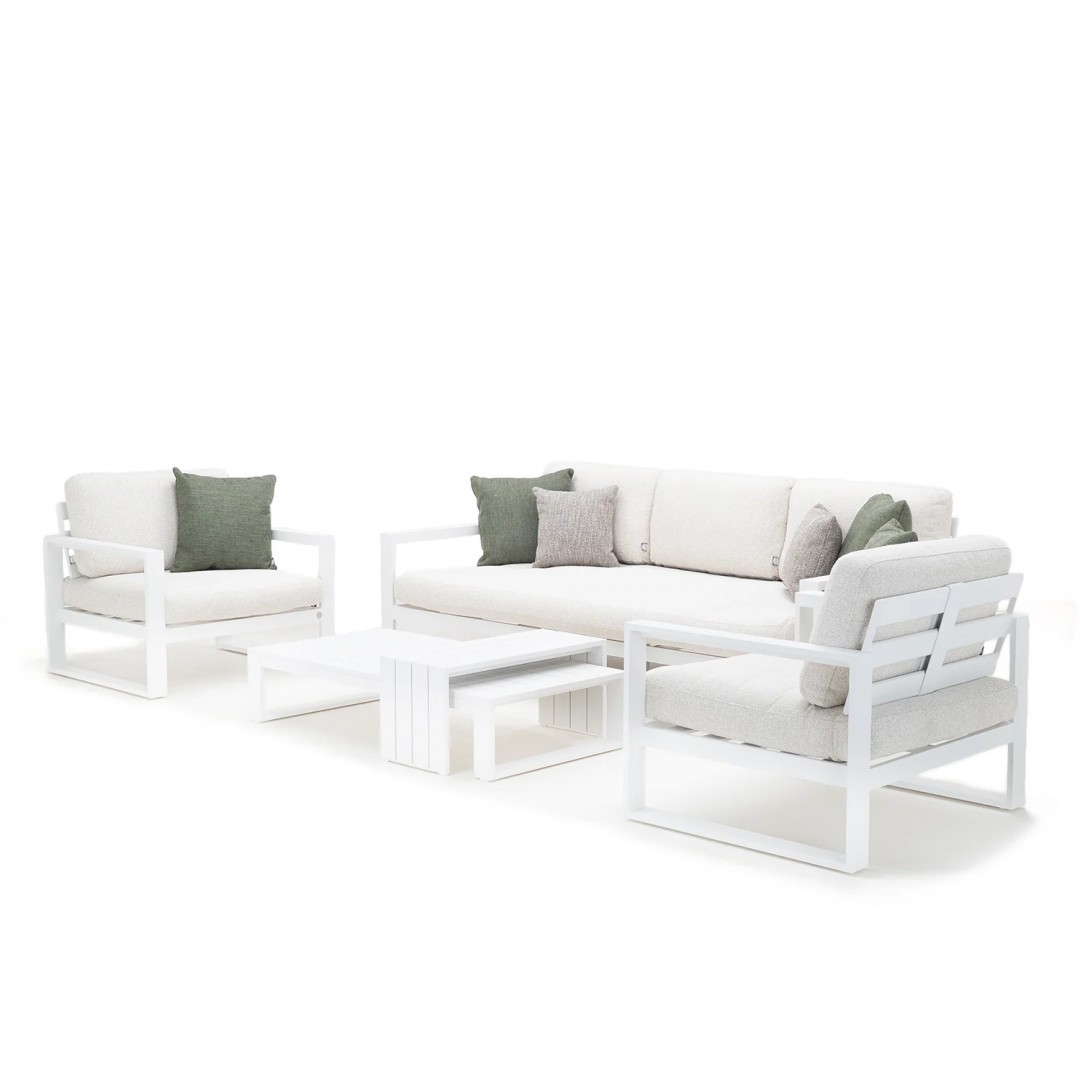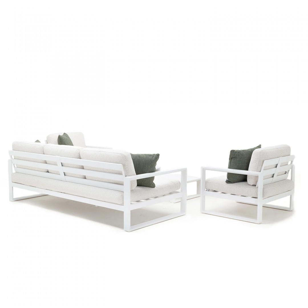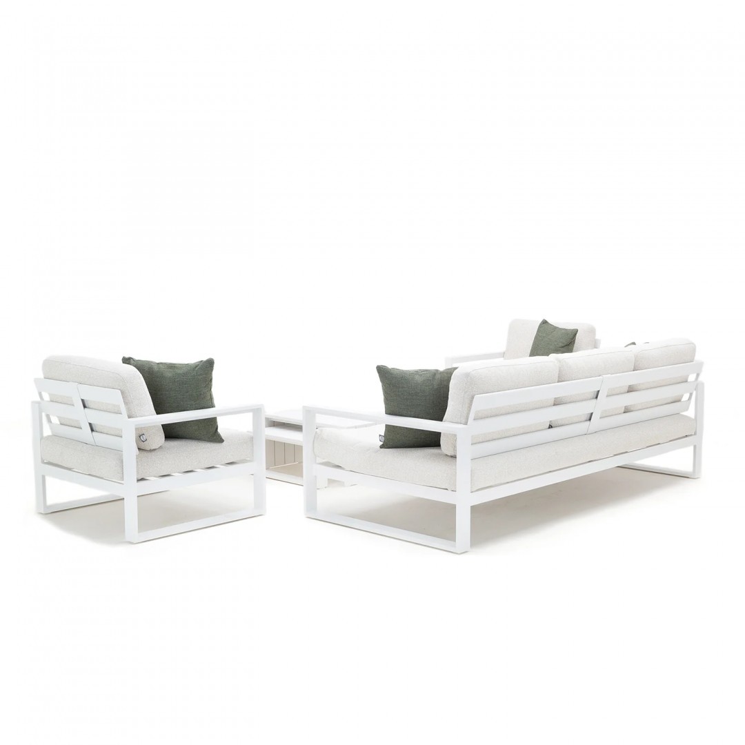 Алюминиевая конструкция с порошковым покрытием обеспечивает стабильность, долговечность и устойчивость к погодным условиям. Сиденья и спинки, обитые тканью Sunproof Jalousie 160 и наполненные стандартным пенополиуретаном, сохраняют свою форму и комфорт даже при интенсивном использовании. Дополнительные съемные подушки повышают комфорт и позволяют настроить комплект в соответствии с вашими индивидуальными предпочтениями.