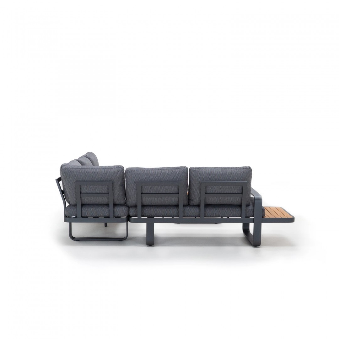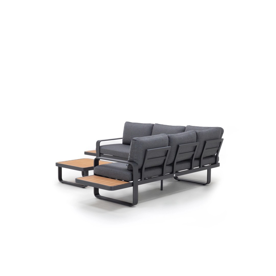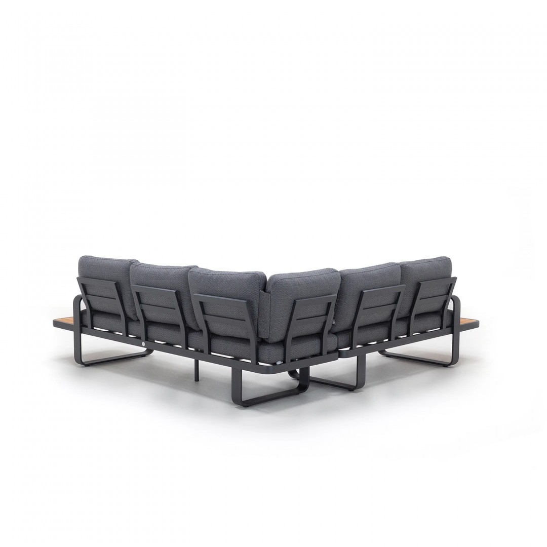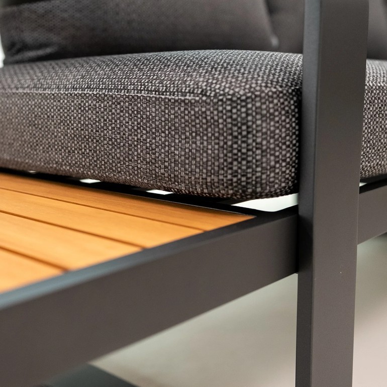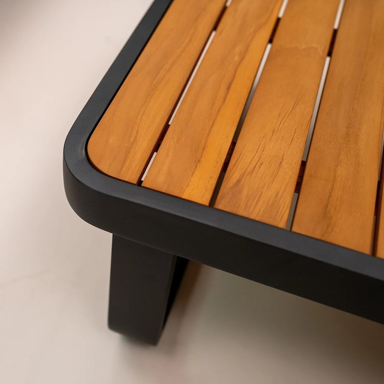 Алюминиевый каркас с порошковым покрытием обеспечивает устойчивость и долговечность в условиях окружающей среды. Обивка сидений и спинок, выполненная из прочной олефиновой ткани, сохраняет свою форму при регулярном использовании. Журнальный столик дополняет комплект столешницей из тикового дерева, показанной на фотографиях, добавляя нотку натурального материала.