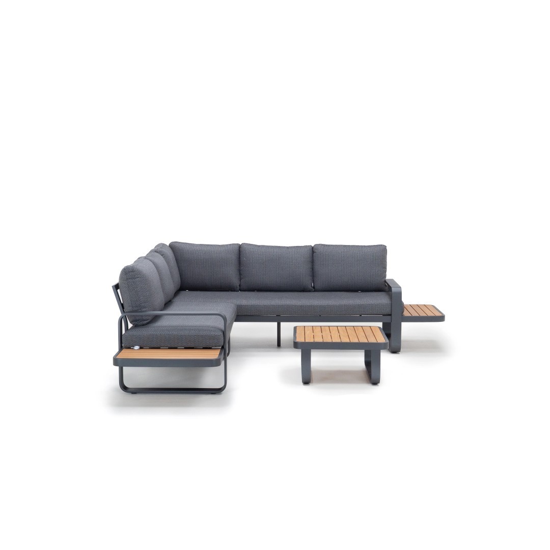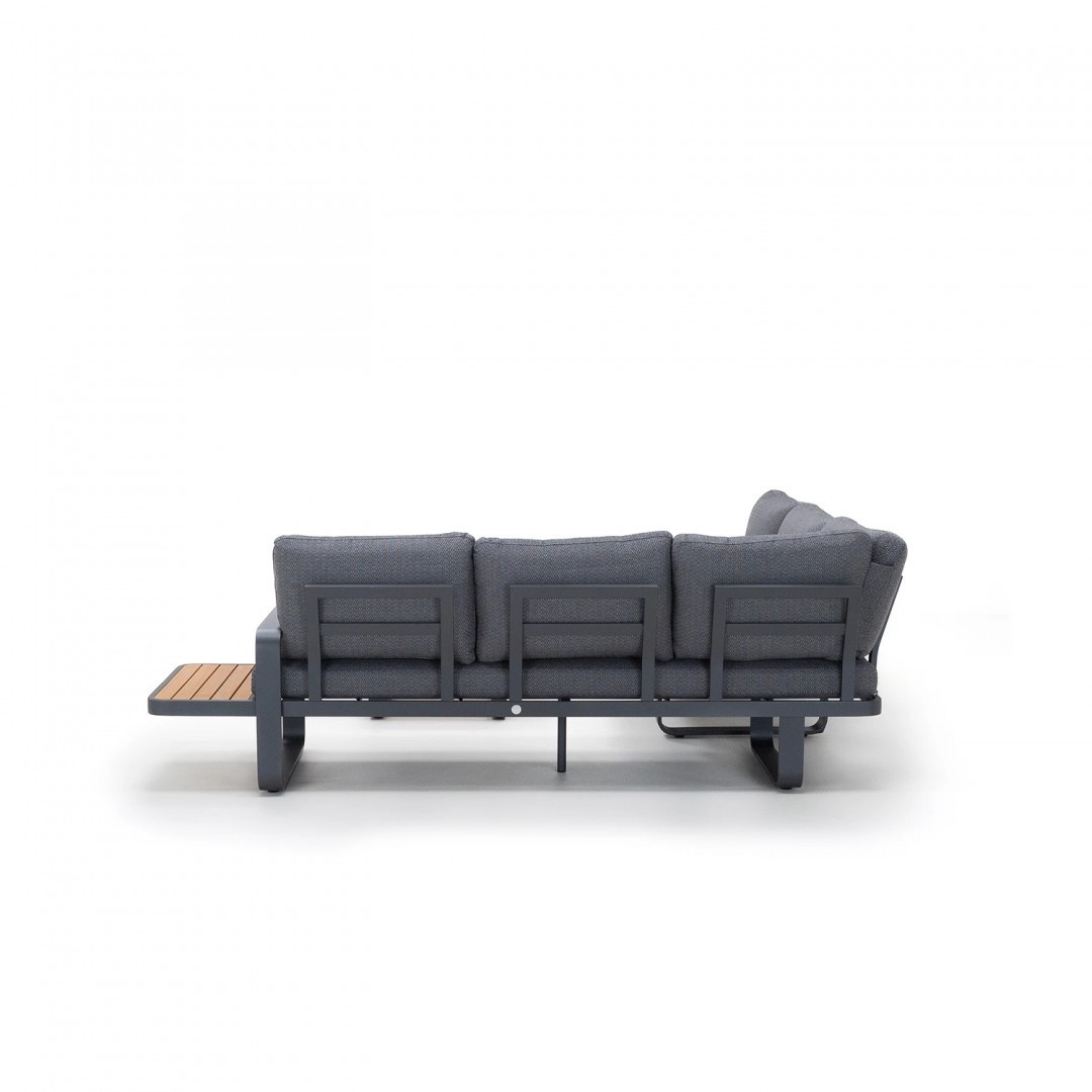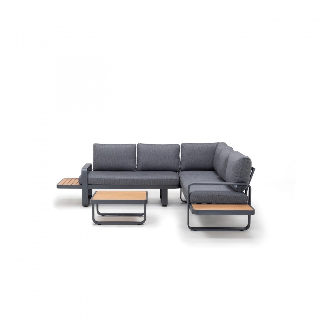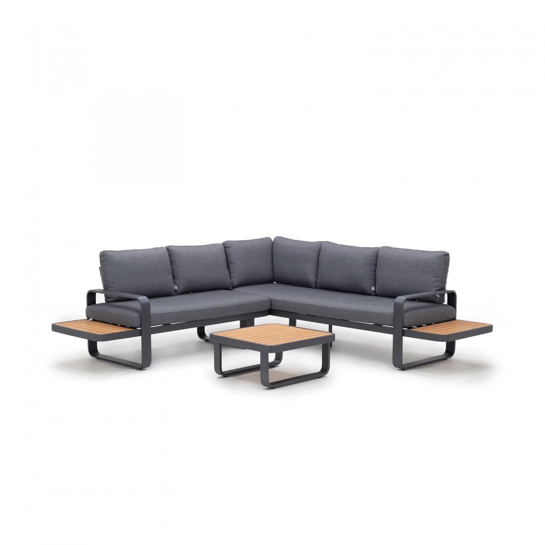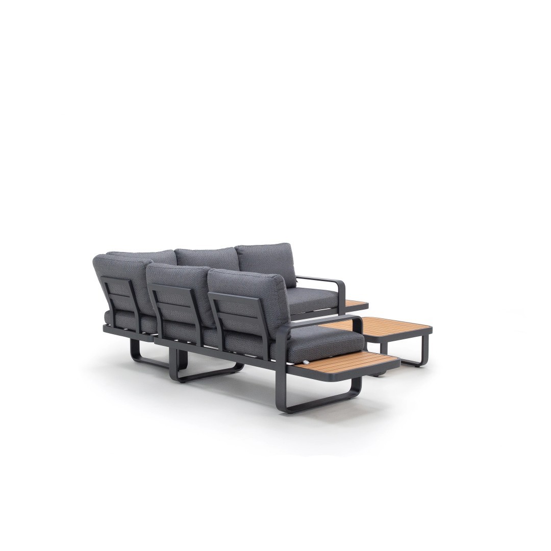 Алюминиевый каркас с порошковым покрытием обеспечивает устойчивость и долговечность в условиях окружающей среды. Обивка сидений и спинок, выполненная из прочной олефиновой ткани, сохраняет свою форму при регулярном использовании. Журнальный столик дополняет комплект столешницей из тикового дерева, показанной на фотографиях, добавляя нотку натурального материала.