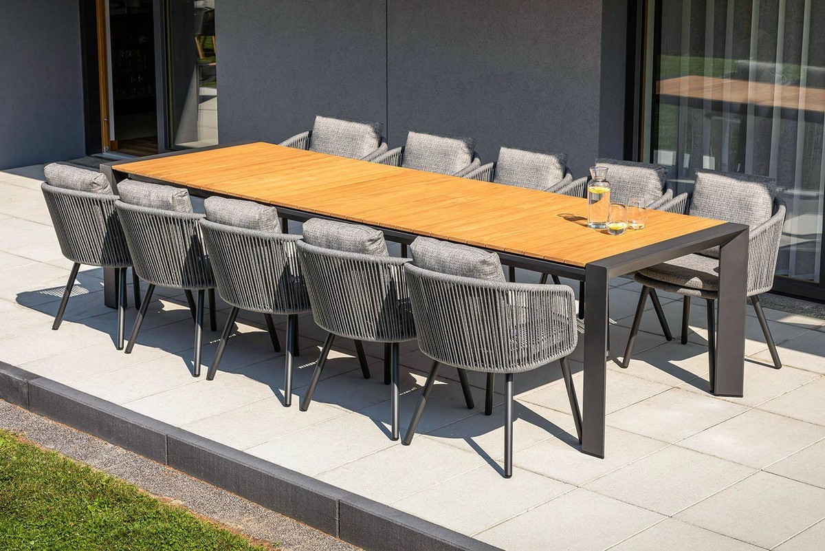Представляем уникальный садовый комплект "MURO III", сочетающий в себе элегантность и современность, который украсит любое открытое пространство. Комплект "MURO III" – идеальный выбор для тех, кто ищет роскошь и комфорт на своей террасе или в саду. Сочетание элегантного стола MURO и десяти удобных стульев HARBOUR антрацитового цвета создает неповторимую атмосферу, которая делает каждый момент на открытом воздухе незабываемым.