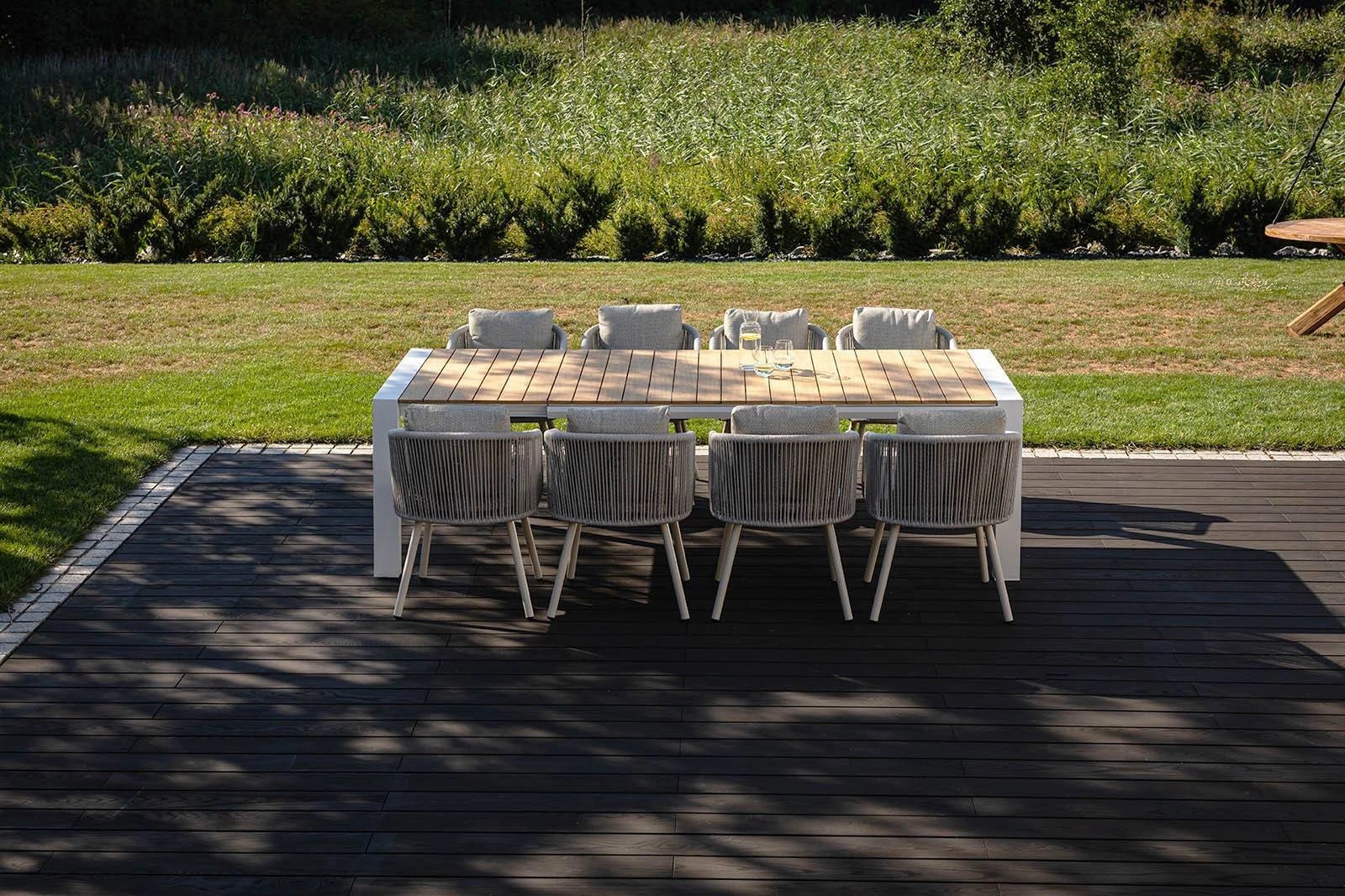 Представляем уникальный садовый комплект "MURO XIV", сочетающий в себе элегантность и современность, который украсит любое открытое пространство. Комплект "MURO XIV" – идеальный выбор для тех, кто ищет роскошь и комфорт на своей террасе или в саду. Сочетание элегантного стола MURO и шести удобных стульев Harbour цвета мокко создает неповторимую атмосферу, которая делает каждый момент на открытом воздухе незабываемым.