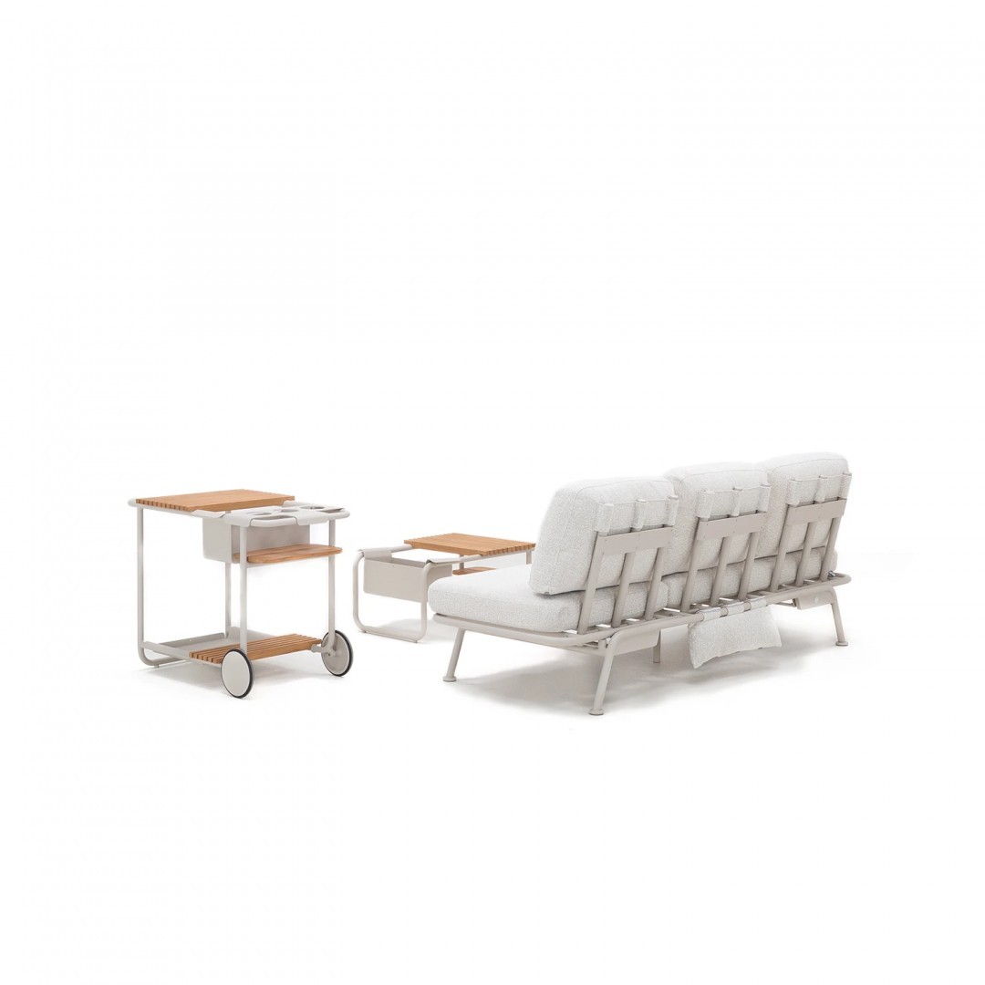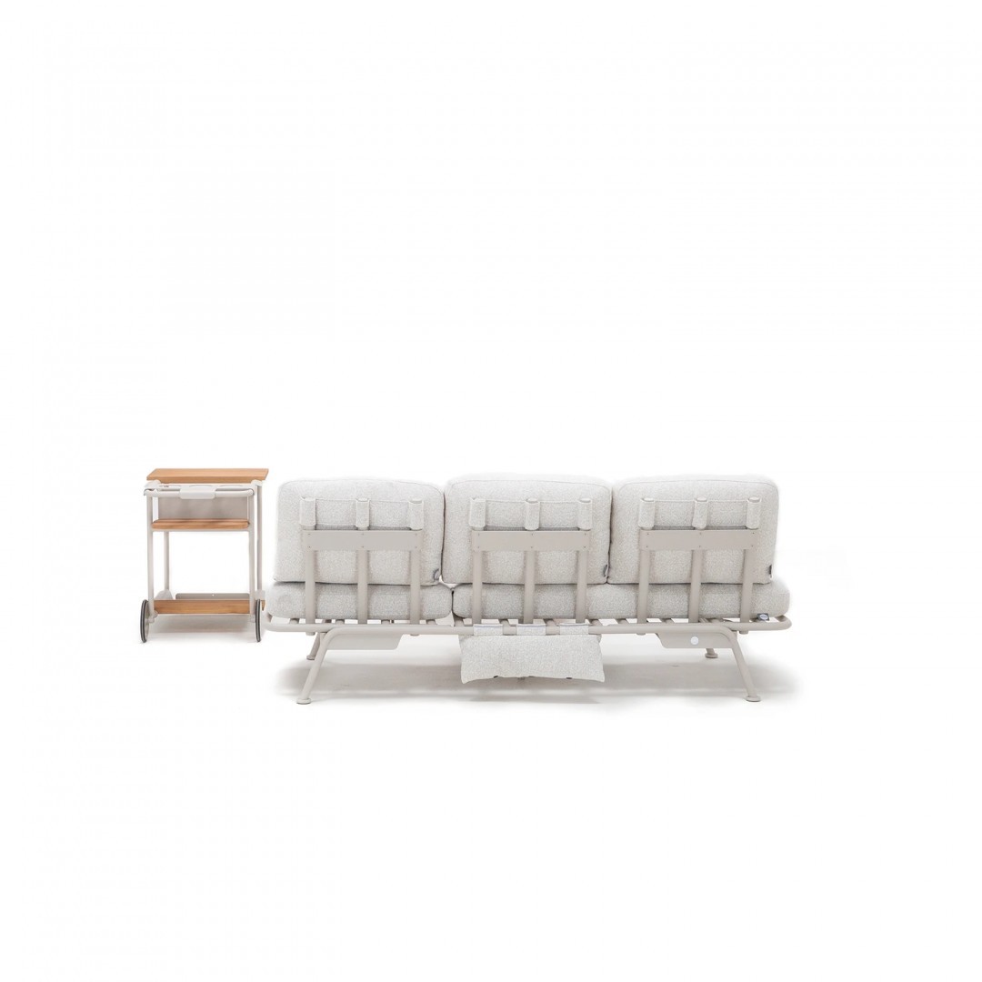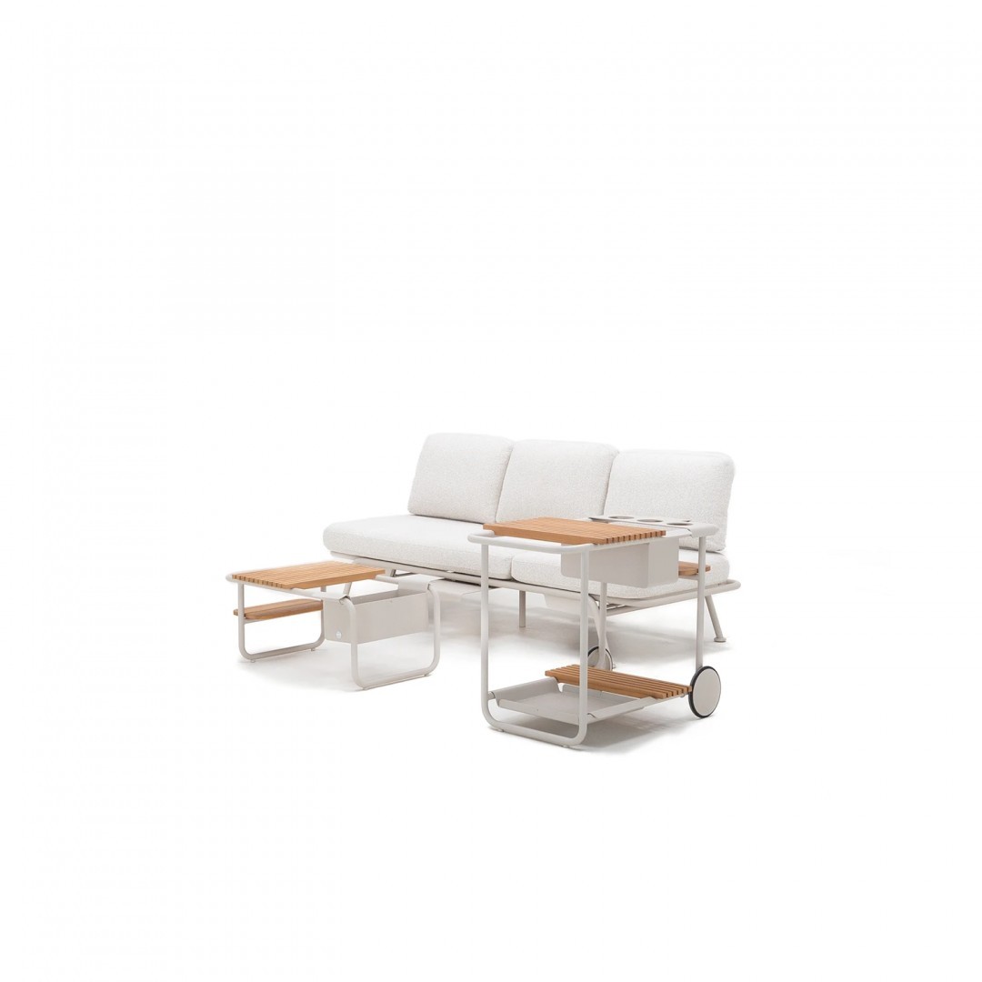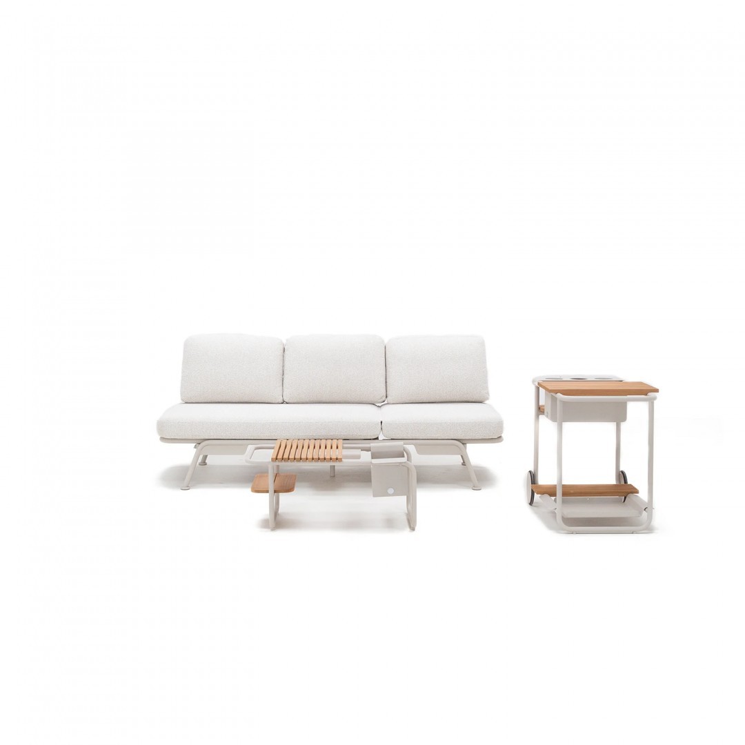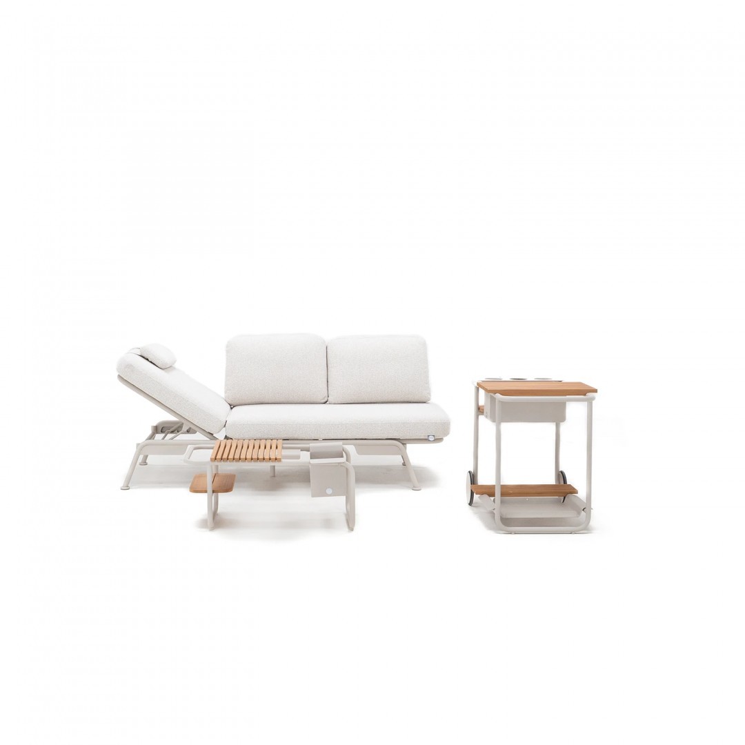 SUNSET – это комплект садовой мебели, разработанный для гибкого использования и повседневного комфорта на открытом воздухе. Центральным элементом комплекта является трехместный диван с регулируемыми спинками с обеих сторон, дополненный журнальным столиком и мобильной тележкой с подносами.