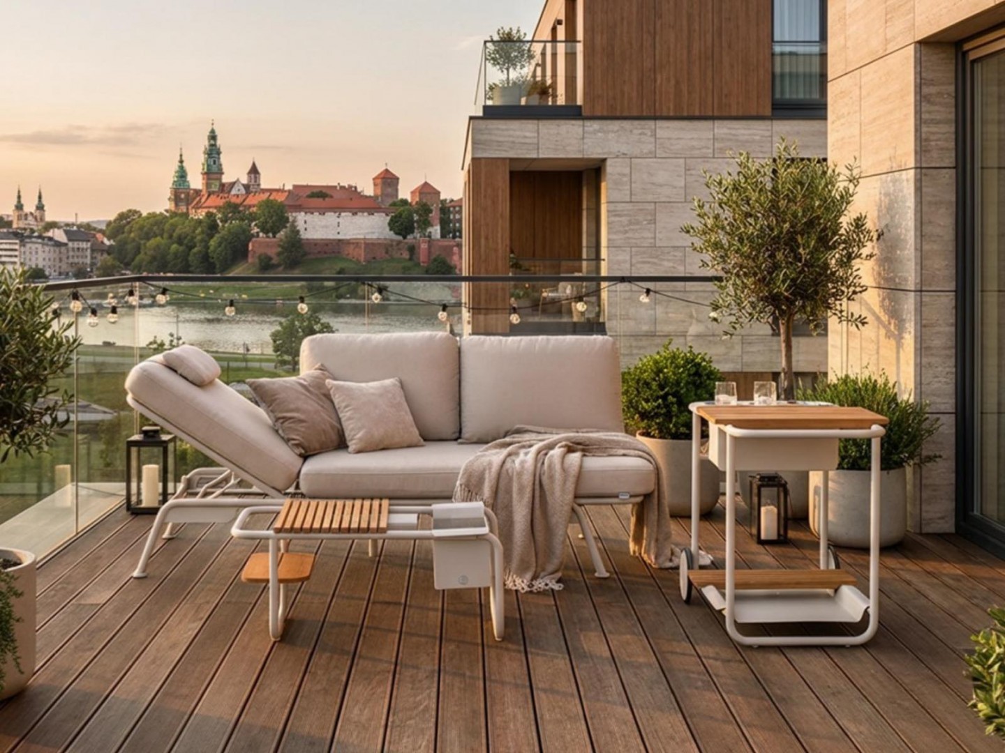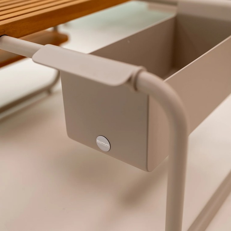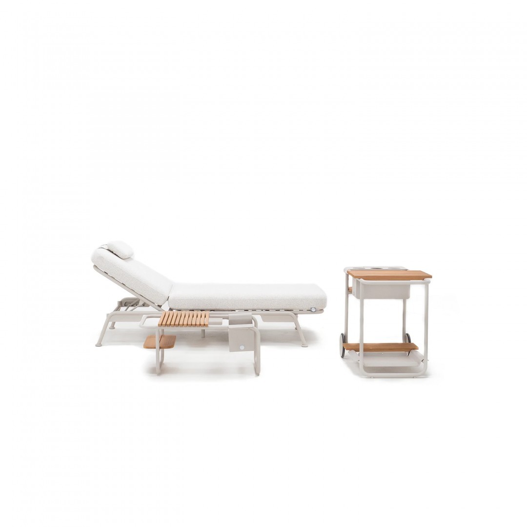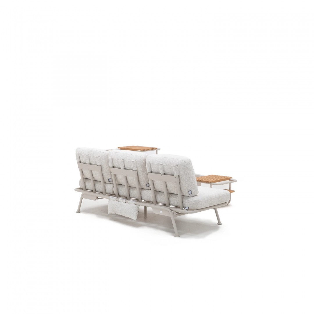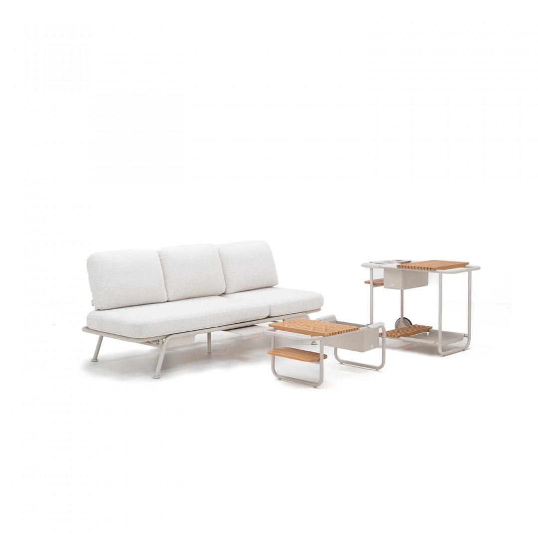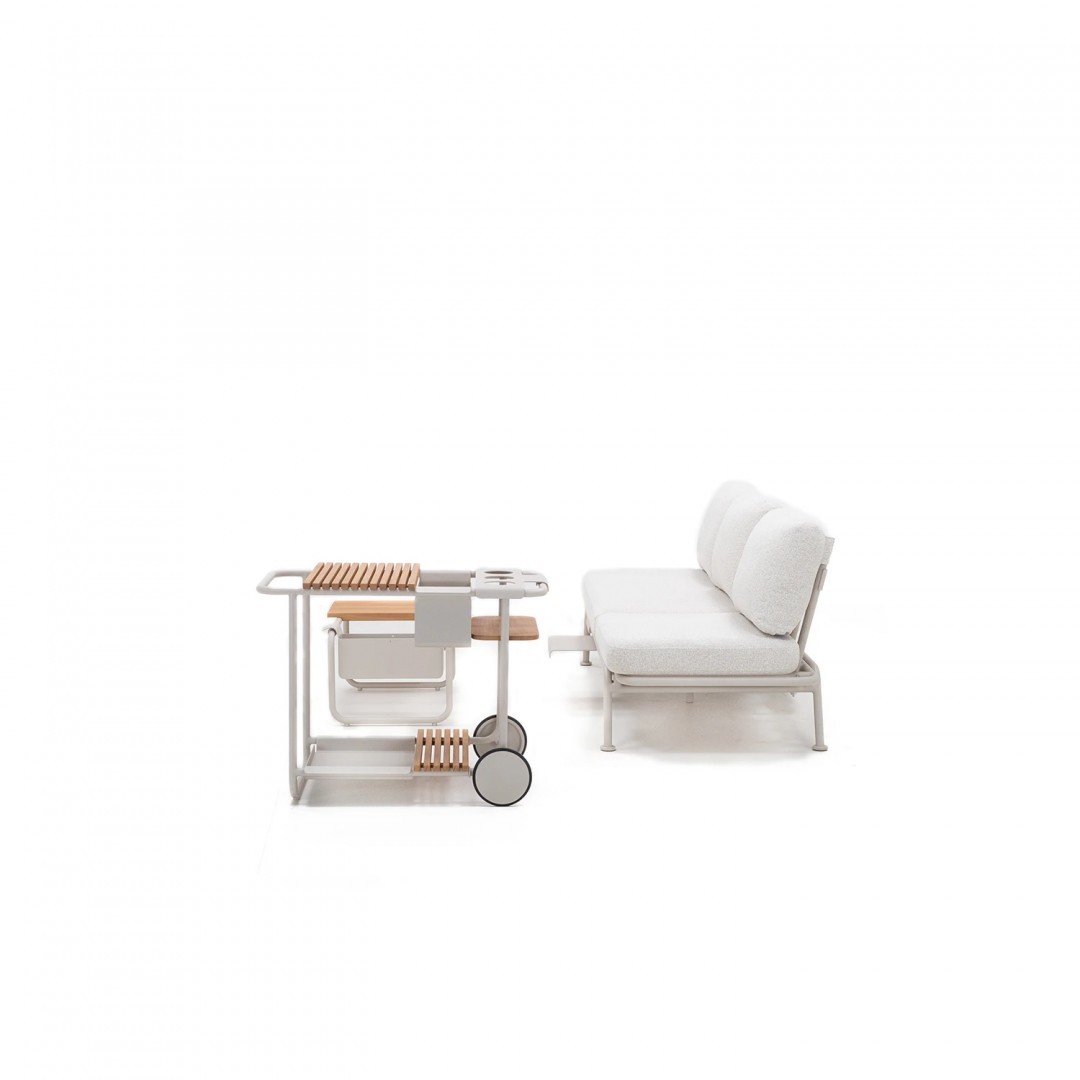 SUNSET – это комплект садовой мебели, разработанный для гибкого использования и повседневного комфорта на открытом воздухе. Центральным элементом комплекта является трехместный диван с регулируемыми спинками с обеих сторон, дополненный журнальным столиком и мобильной тележкой с подносами.