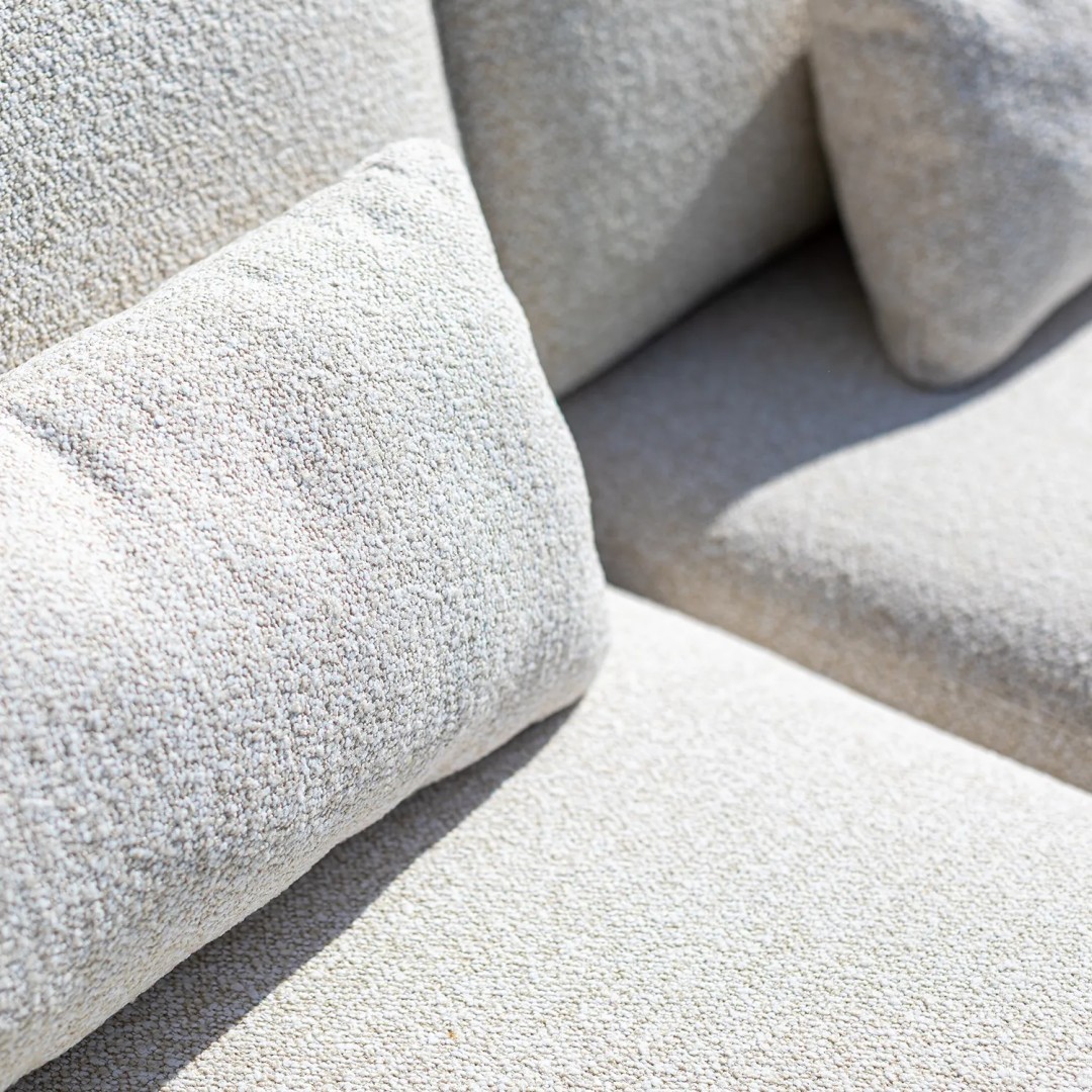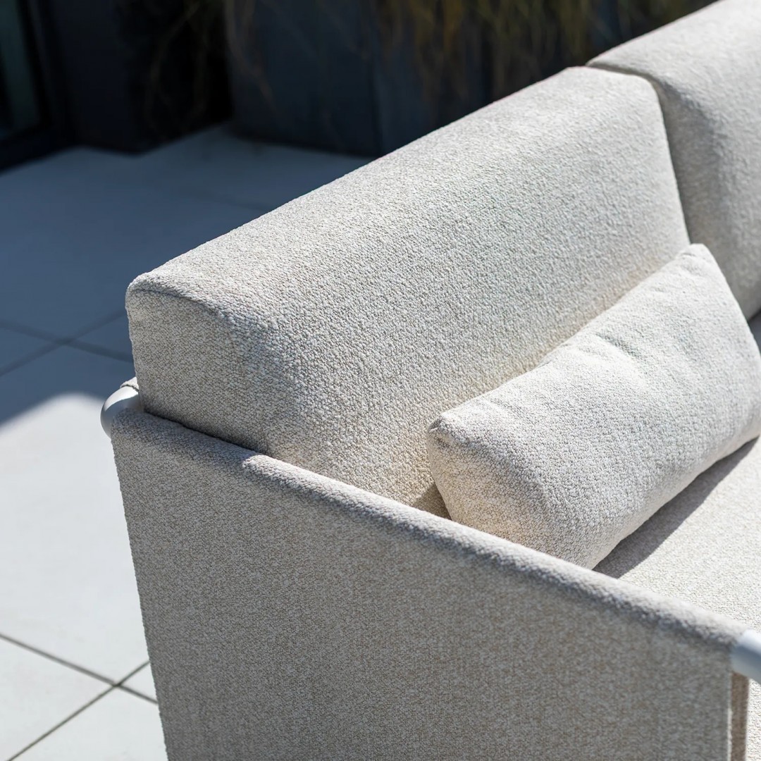 Алюминиевая конструкция с порошковым покрытием обеспечивает стабильность и устойчивость к воздействию внешних условий. Подушки сиденья и спинки, обитые тканью Sunproof, предназначены для использования на открытом воздухе, с акцентом на прочность материала и длительный комфорт.